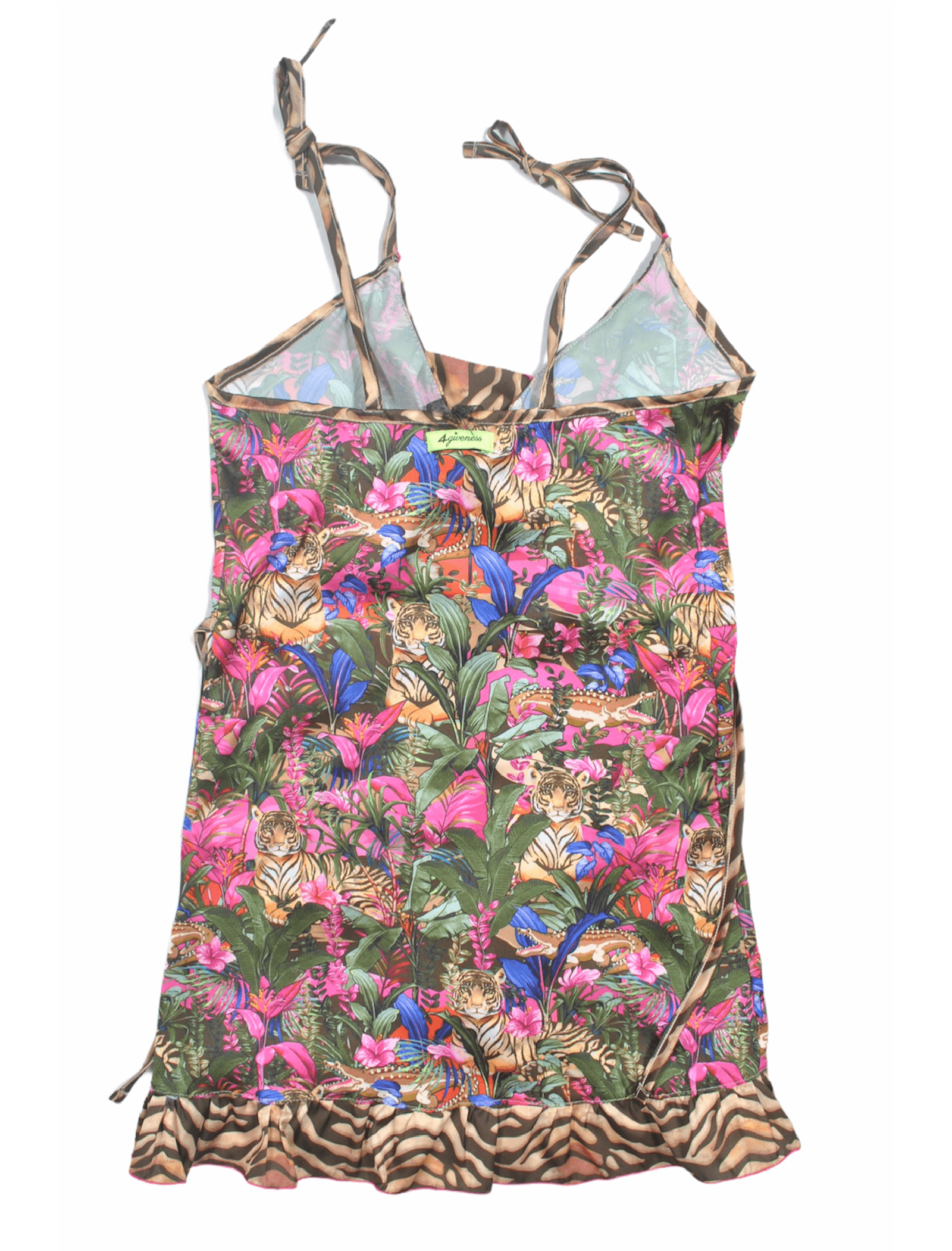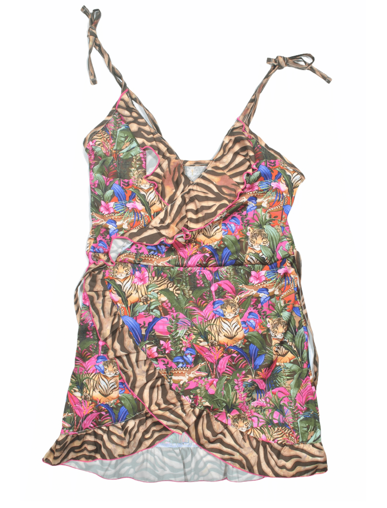 fantasia tropic. Con rouches maculata,spalline regolabili e coulisse in vita.