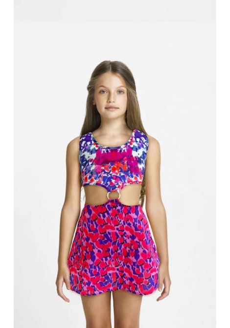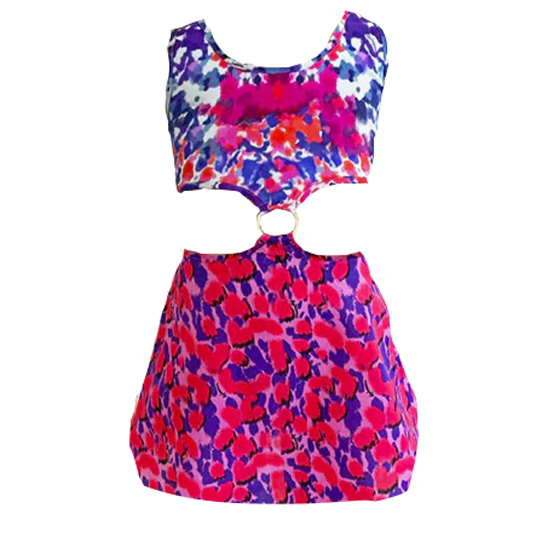 Abito corto in fantasia con cerchio centrale e aperture laterali.