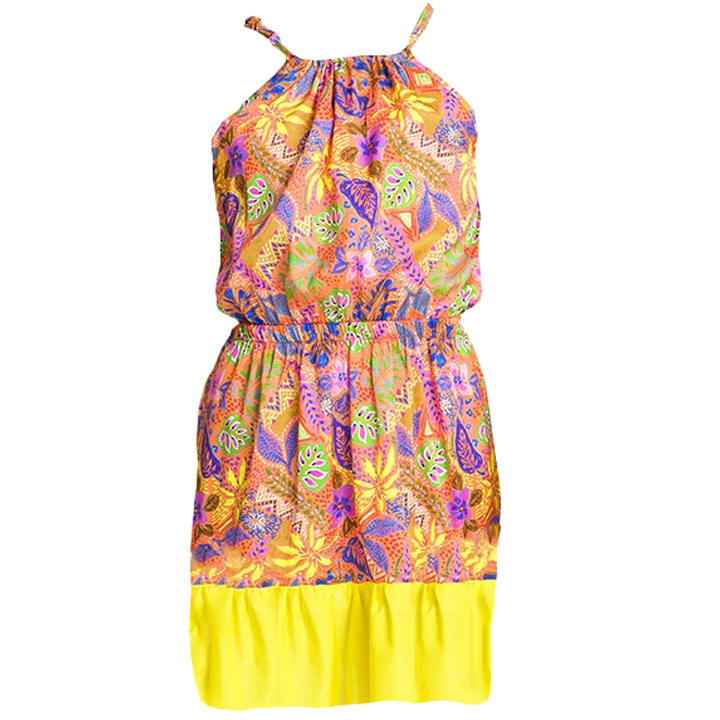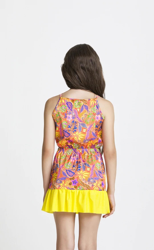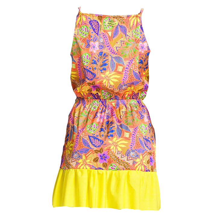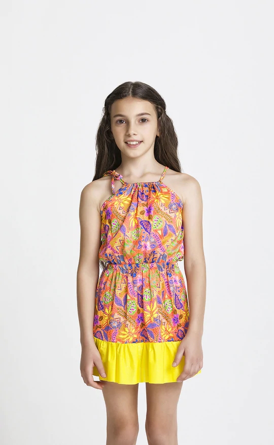 Abito corto in fantasia con spalline.