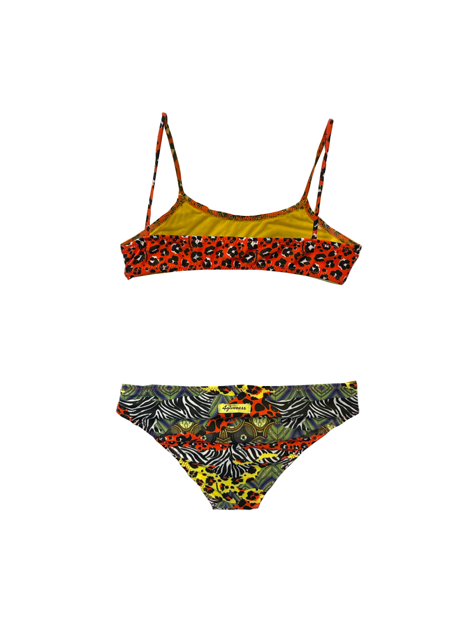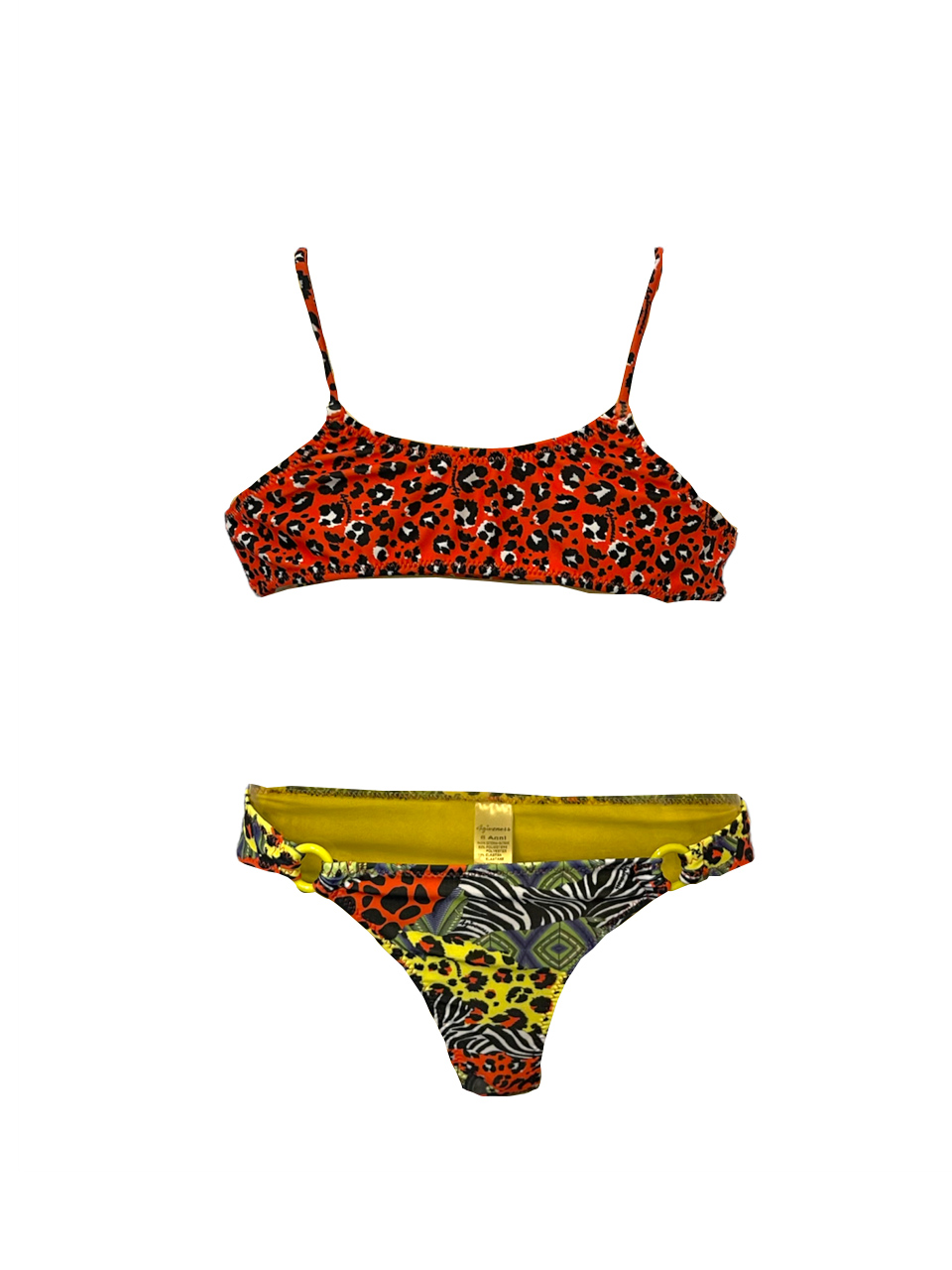 Bikini fantasia top, slip con cerchi sui fianchi.