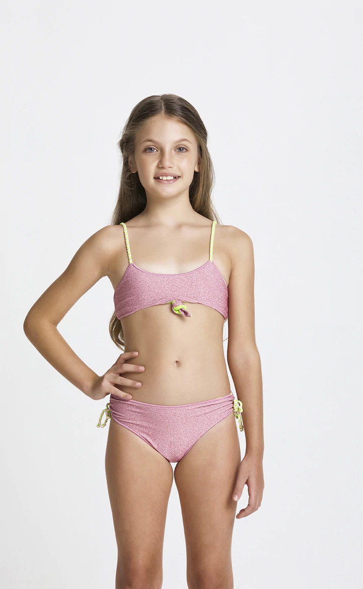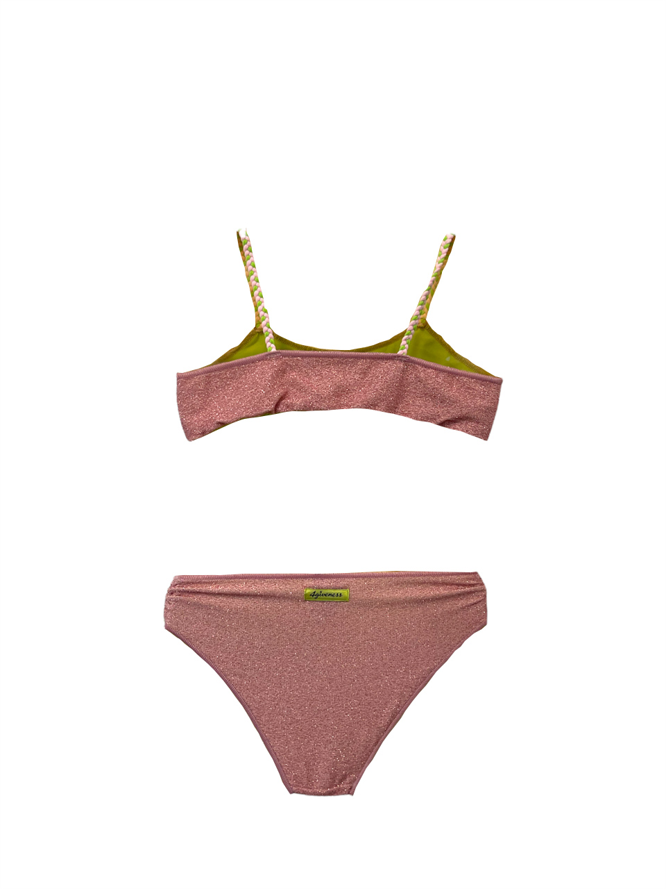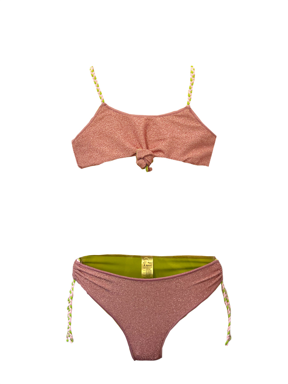 Bikini fascia in lurex con fiocchetto centrale e con slip con laccetti.