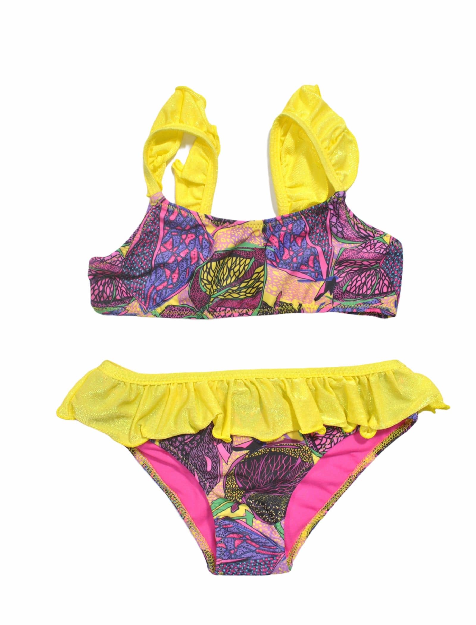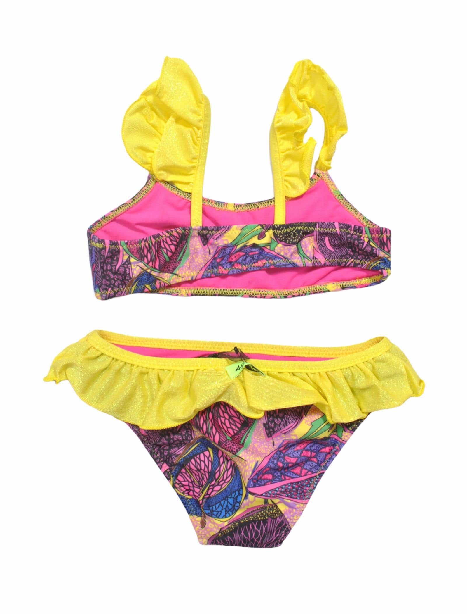 di colore viola. Top con bretelle a contrasto di colore giallo, slip con volant di colore giallo.