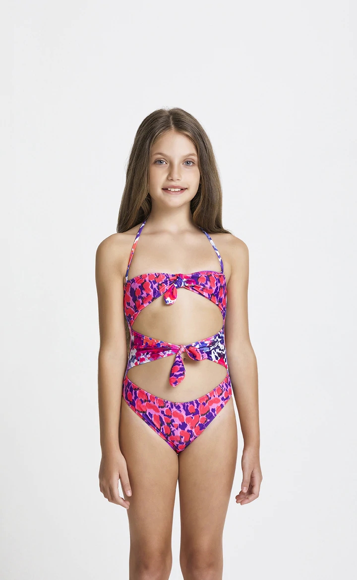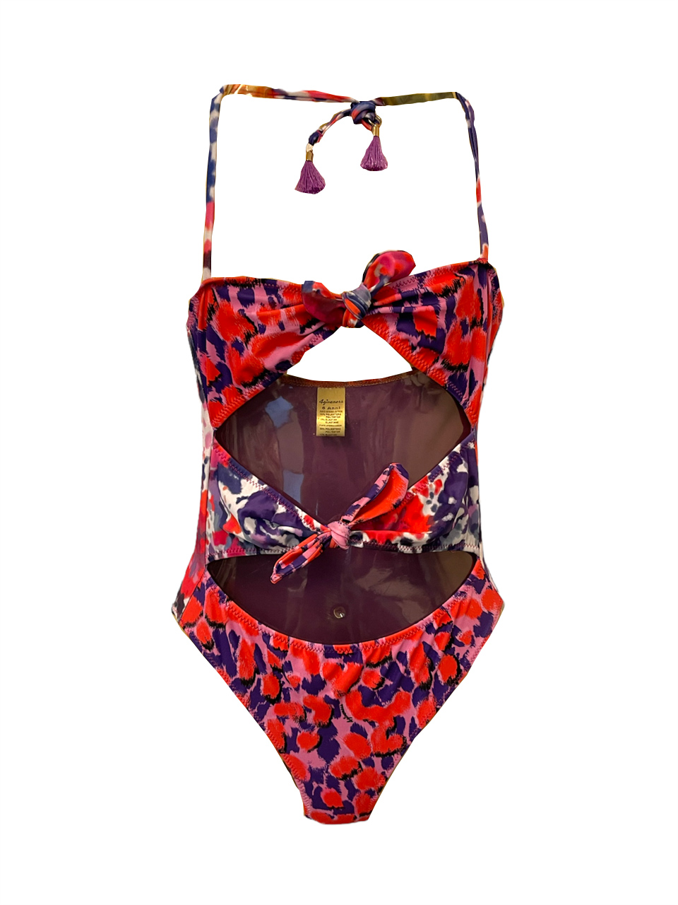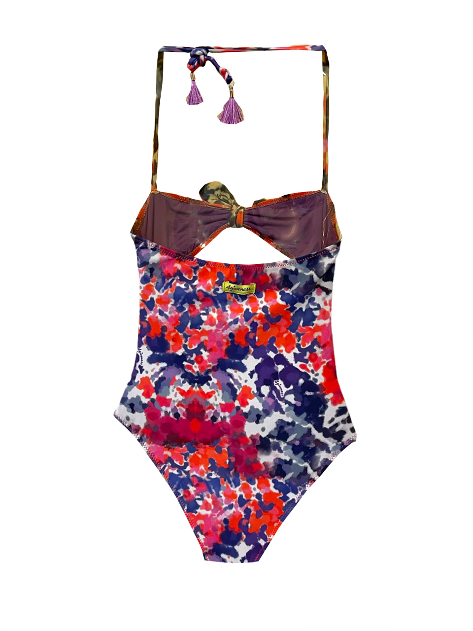 Monokini in fantasia con fiocchi, laccetti con nappine.