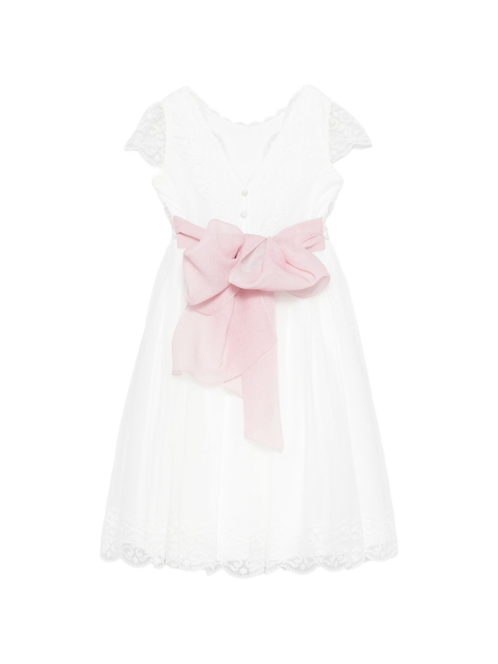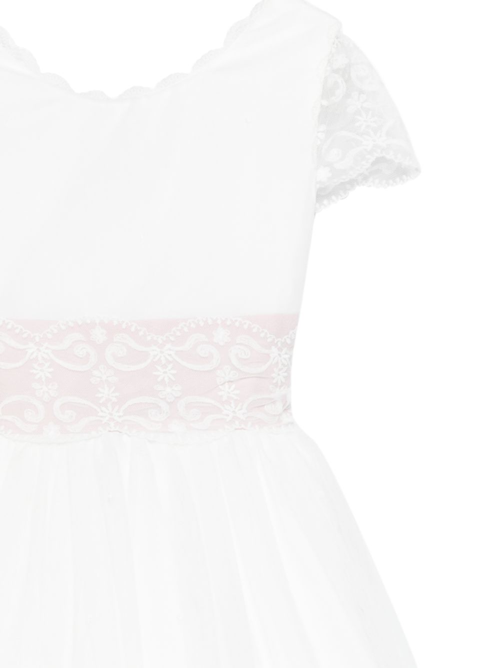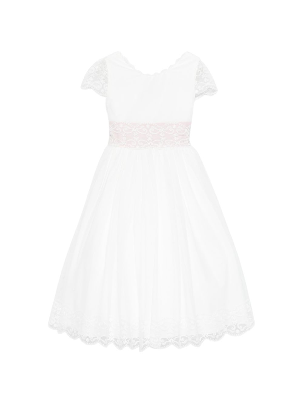 Abito a maniche corte con rifiniture in pizzo e cintura con fiocco
