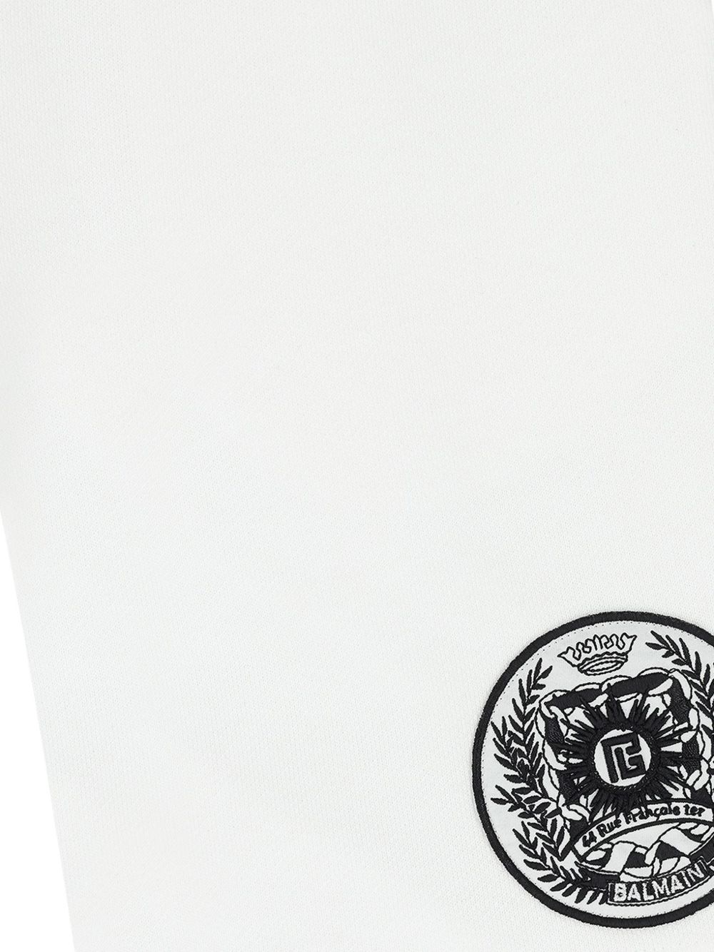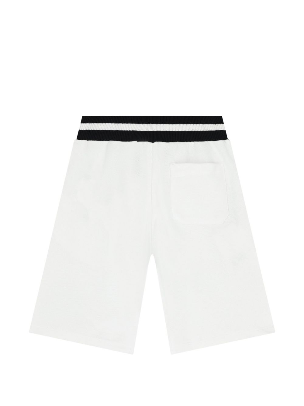 bianco con elastico in vita tasche a filo e logo stampato sul davanti.