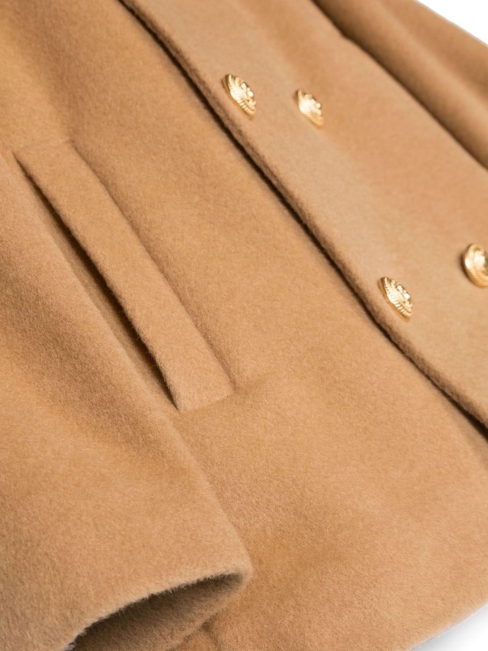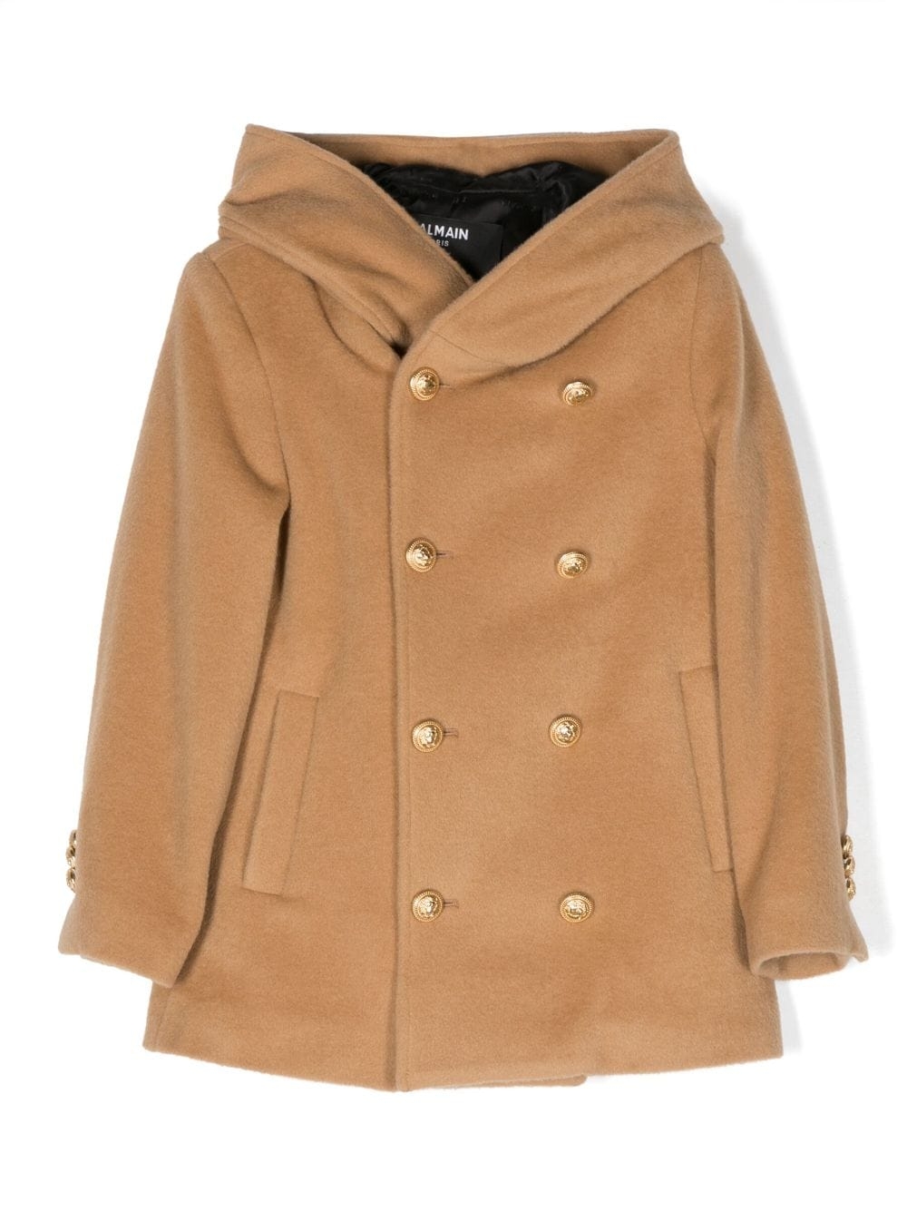 Cappotto doppiopetton misto lana, con bottoni oro e cappuccio.