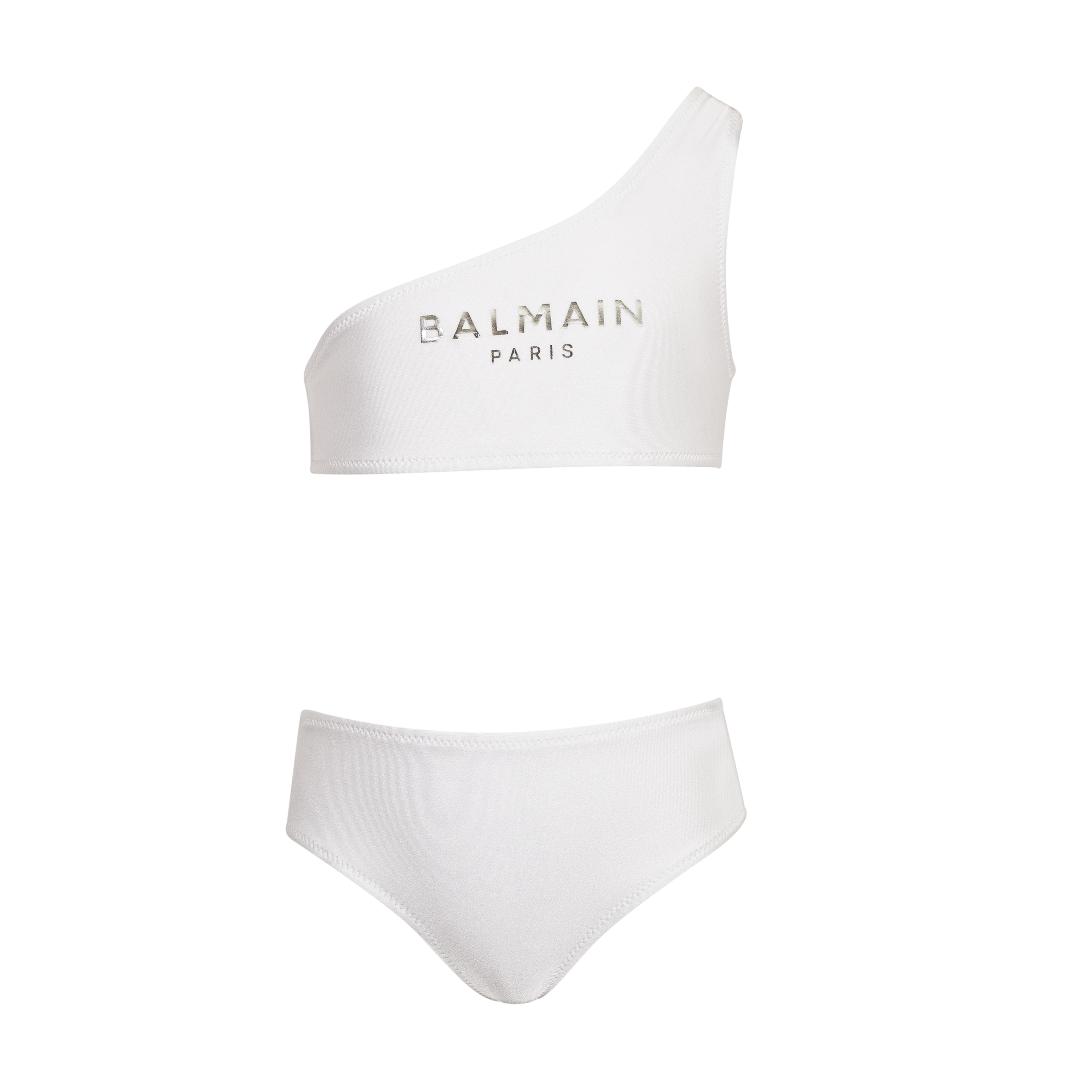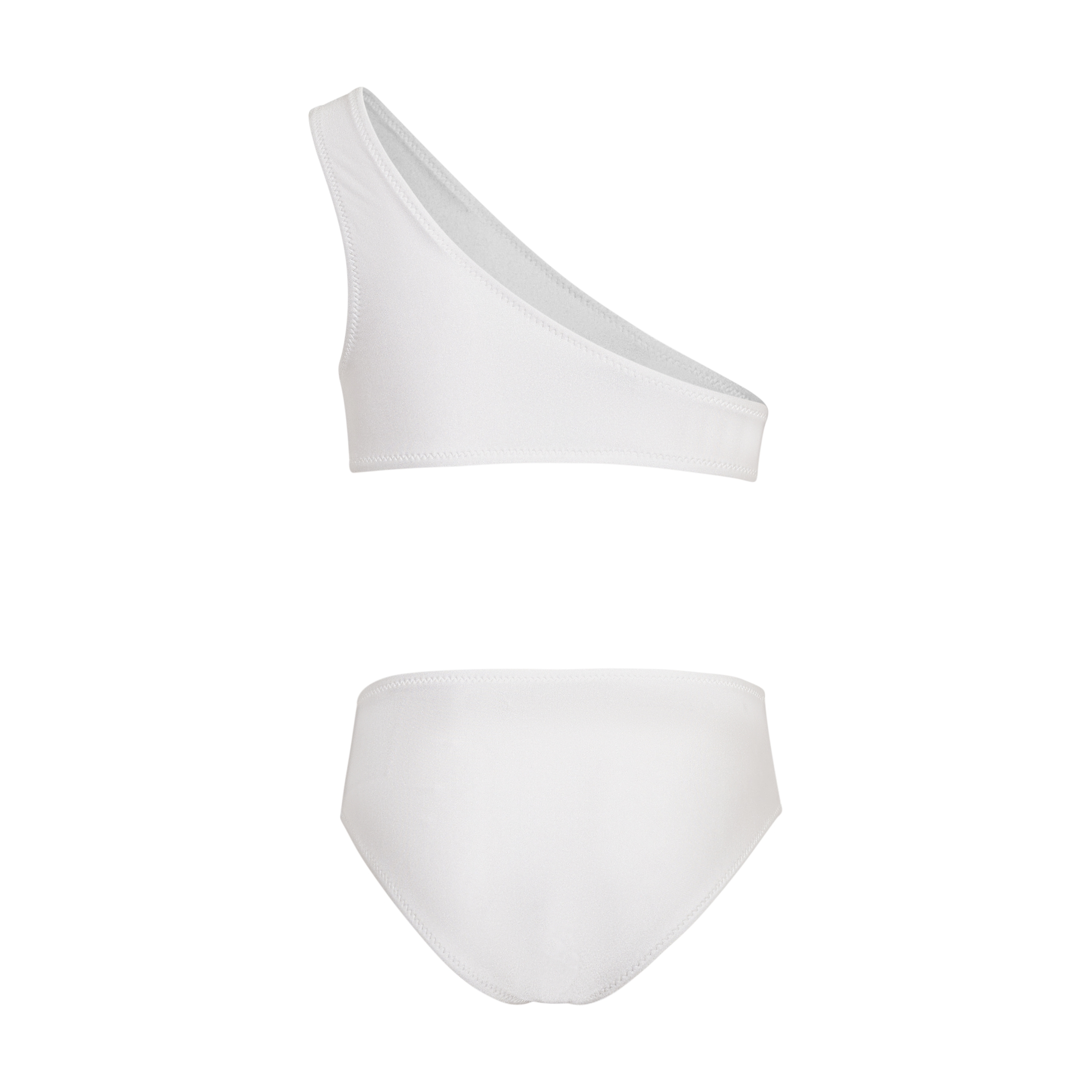 Costume bianco 2 pezzi con logo argento sul davanti, con top monospalla e slip fisso.