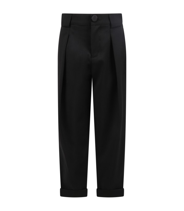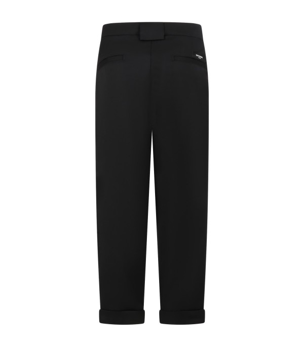 Pantaloni neri con vita regolabile grazie agli elastici interni con bottone, passanti per cintura, chiusura con bottone e zip sulla parte anteriore, tasche laterali e tasche sulla parte posteriore. Sono decorati con patch logato sulla