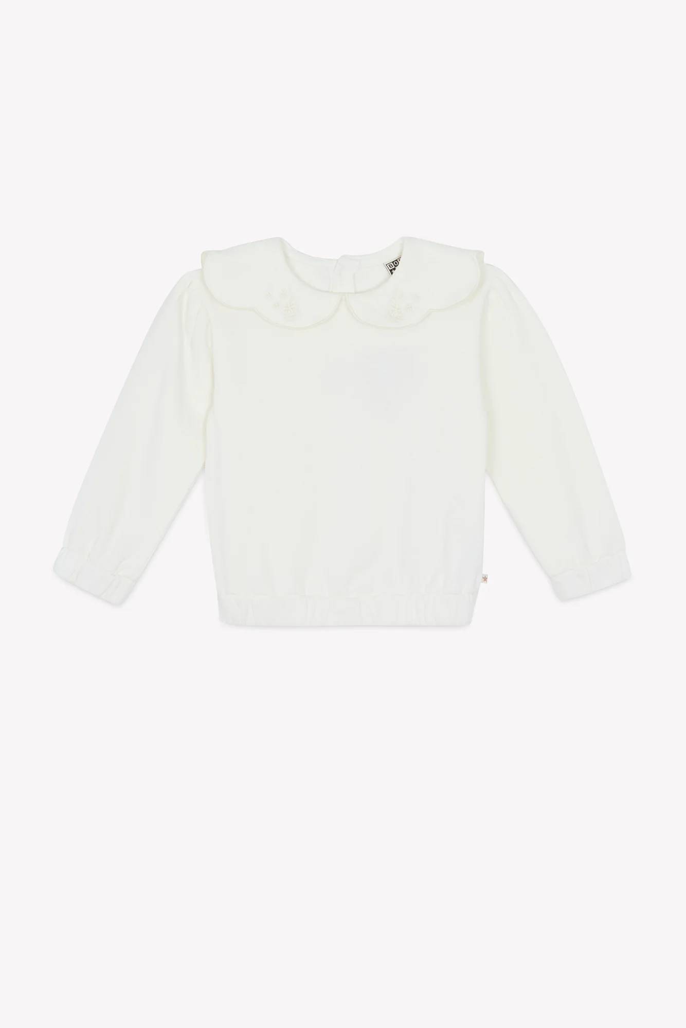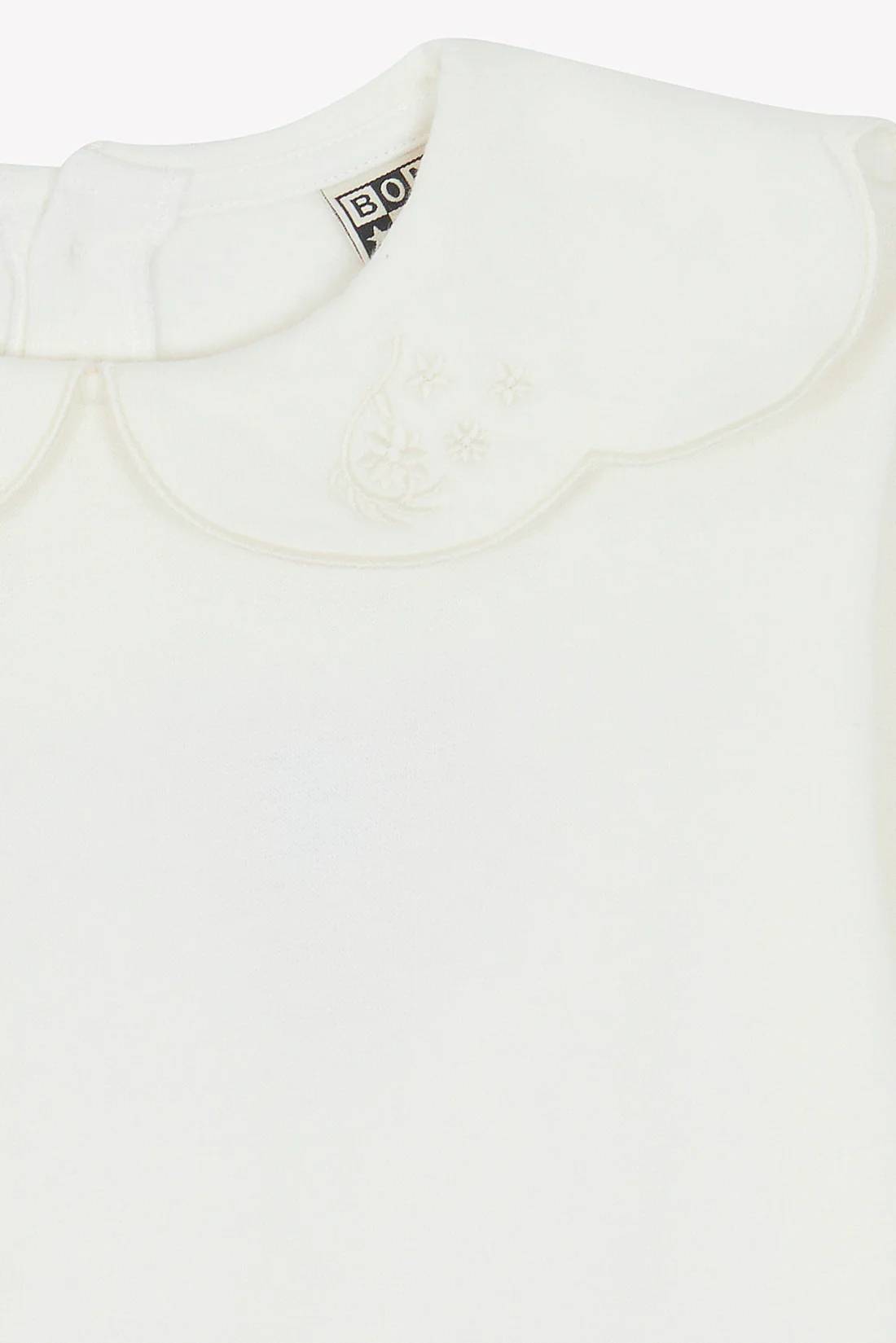 Camicia con ricamo sul colletto,elastico ai polsi e sul fondo, abbottonatura con bototncini sul retro.