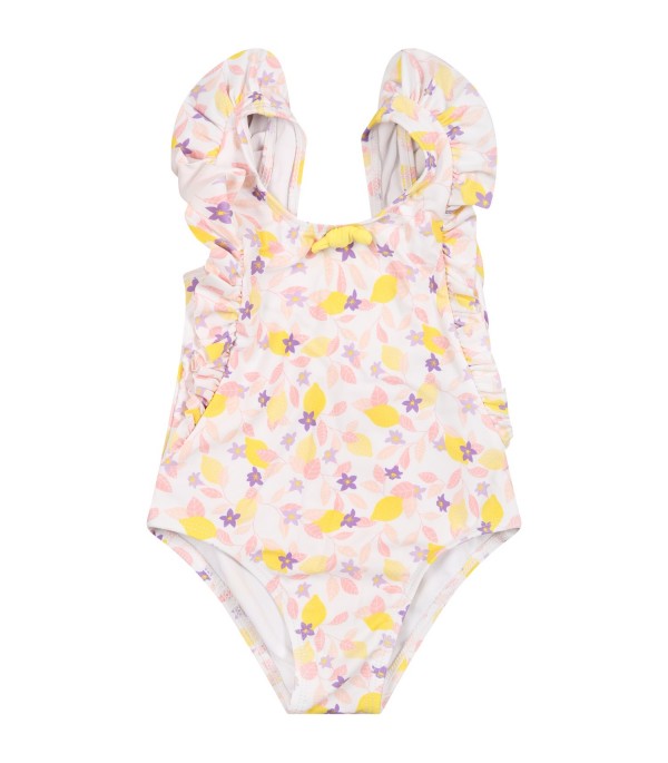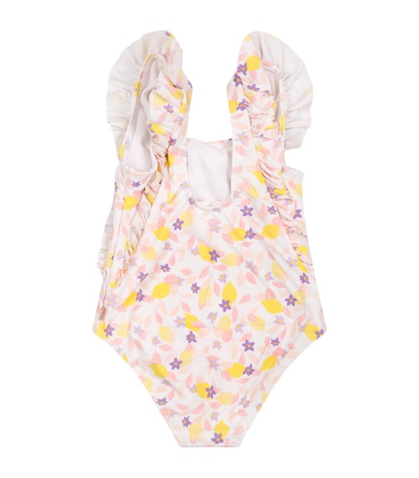 Costume bianco intero. È decorato con stampa fiori all-over, rouches sulle spalline e nodo sulla parte anteriore.