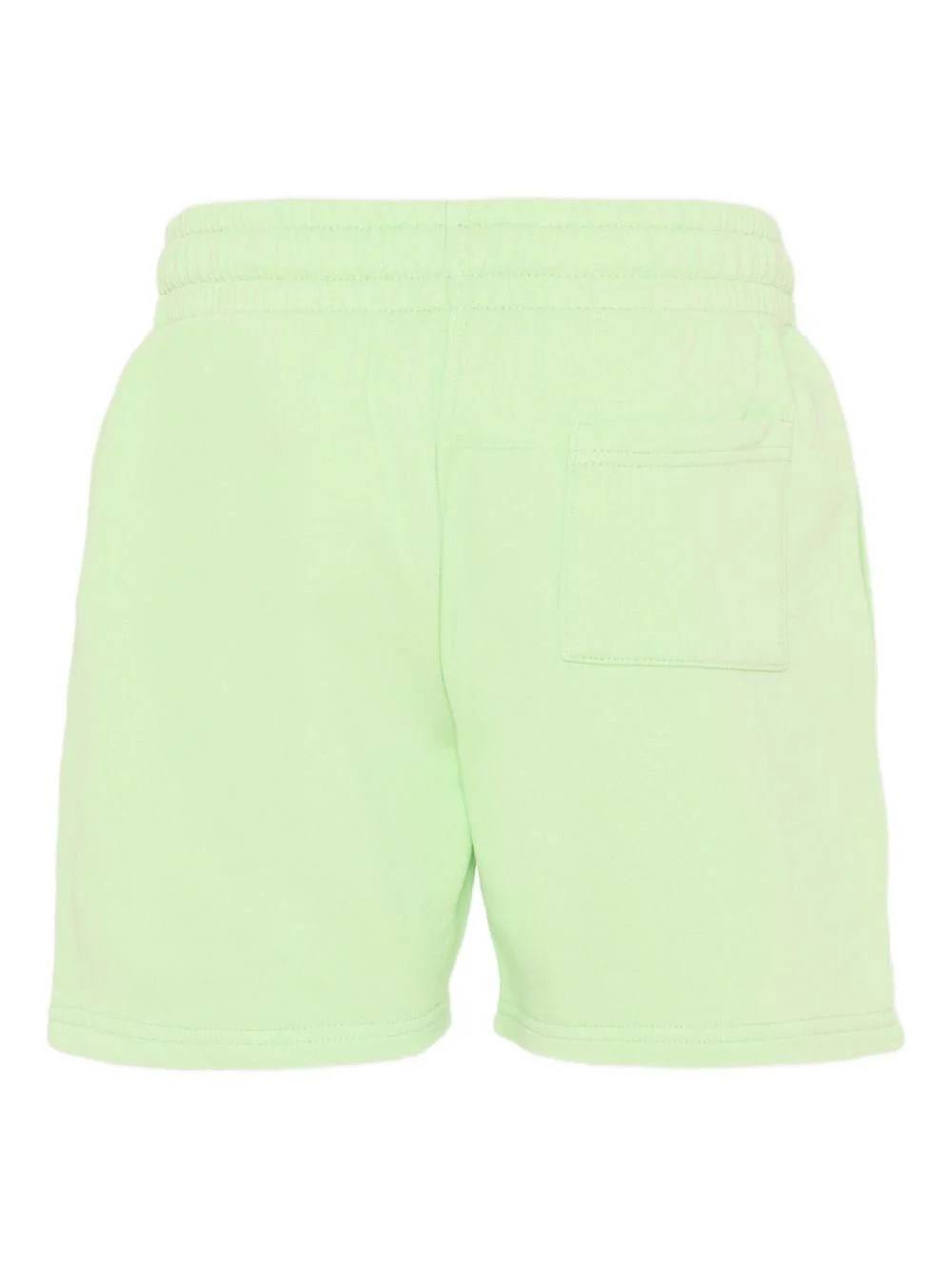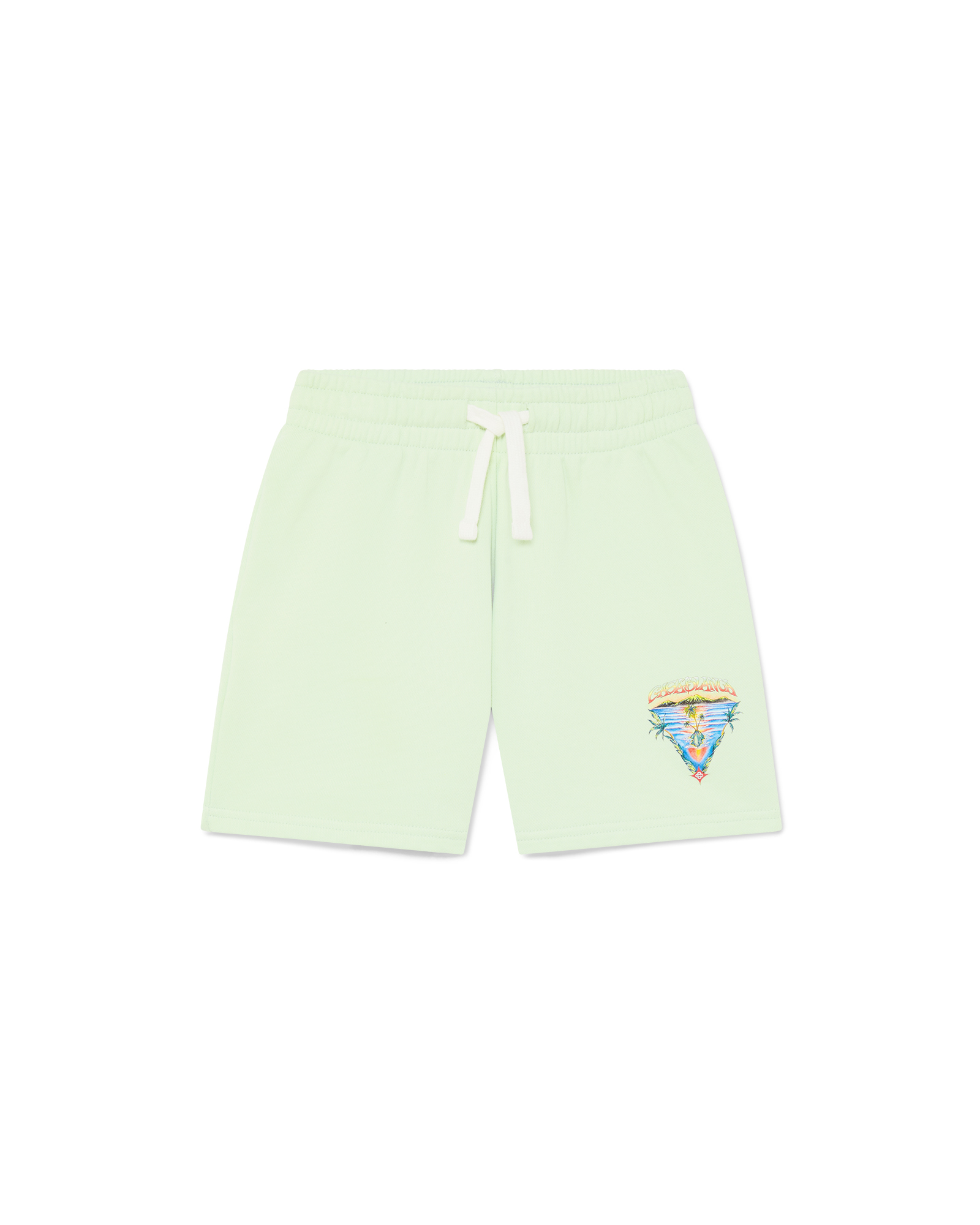 Bermuda verde raffinato che presenta una scena oceanica al tramonto con un'isola al centro, realizzati in uno stile influenzato dall'arte classica delle t-shirt surf. Completato da cintura elasticizzata, chiusura con laccia, tasche laterali e tasca con toppa posteriore.