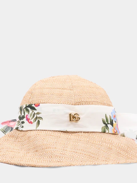 Cappello di paglia beige Dolce&Gabbana Kids in intreccio leggero con tesa morbida e flessibile che protegge delicatamente il viso. Fascia in tessuto bianco a contrasto avvolge la cupola e presenta una stampa floreale multicolor con fiori e foglie dal tratto vivace. Sul davanti piccolo DG logo dorato applicato al centro della fascia aggiunge un accento luminoso e riconoscibile. Sul retro grande fiocco strutturato nello stesso tessuto stampato crea un volume scenografico mantenendo un aspetto equilibrato. L'insieme di paglia naturale, fascia stampata e fiocco posteriore genera un profilo raffinato e ben definito.