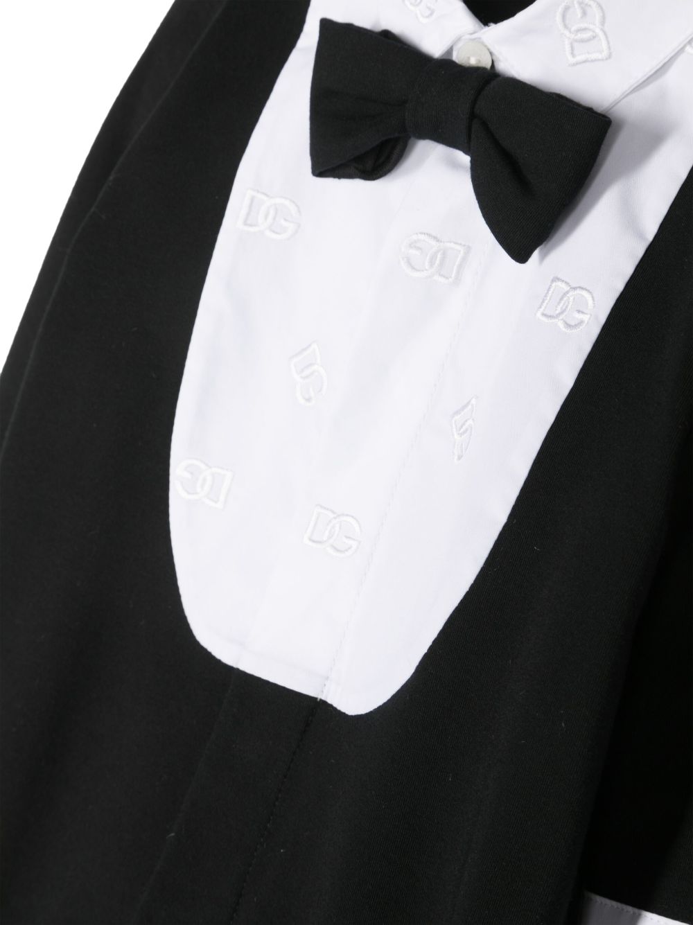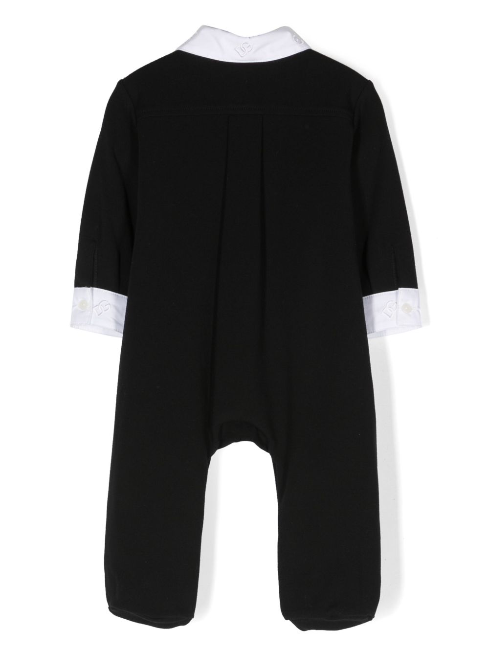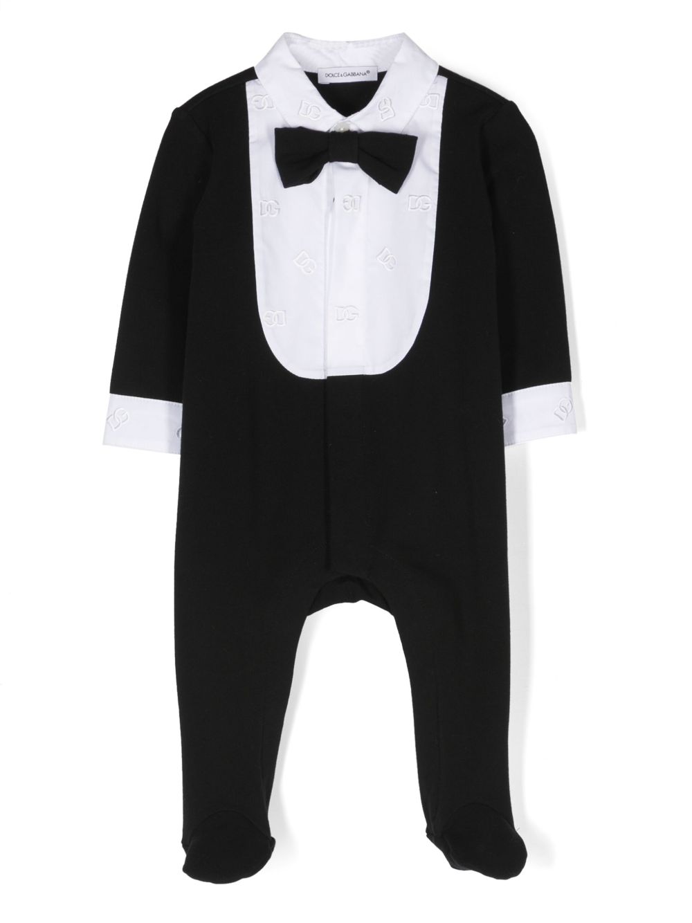 Nero/bianco, ricamo con logo all-over, dettaglio fiocco, colletto classico, chiusura frontale nascosta, maniche lunghe e design a calzino.
