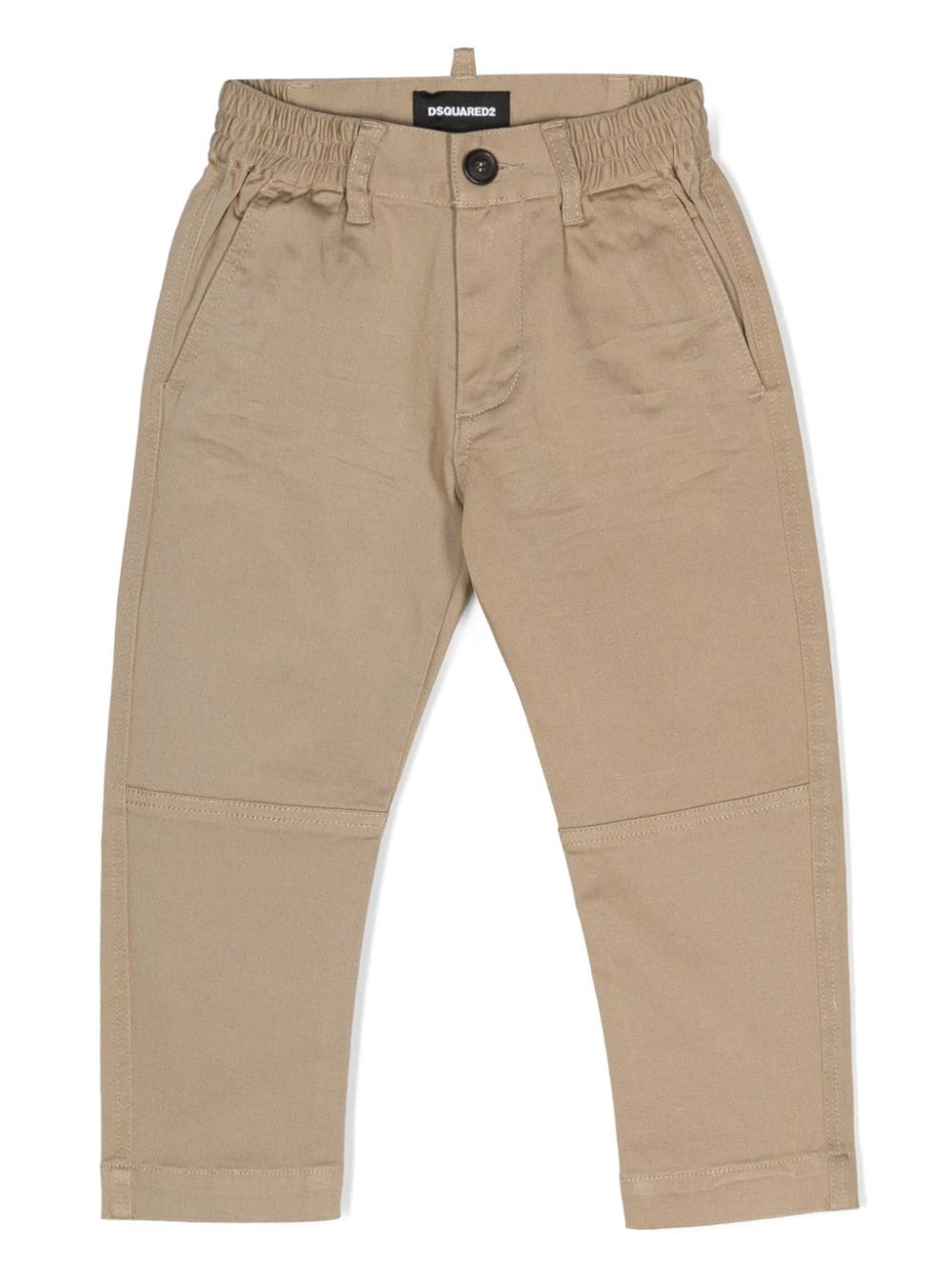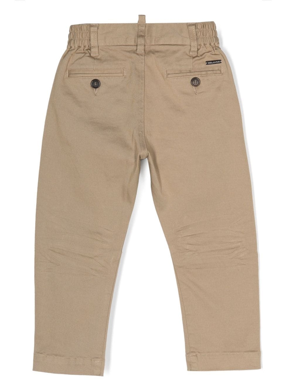 Beige, chiusura frontale con bottoni e zip, passanti, vita elasticizzata, tasche a soffietto ai lati, due tasche posteriori a filetto e taglio straight.