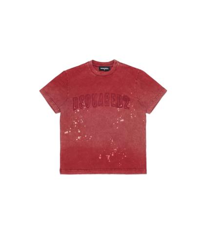 T-shirt con logo rossa effetto vissuto con sghizzi di pittura. mezza manica