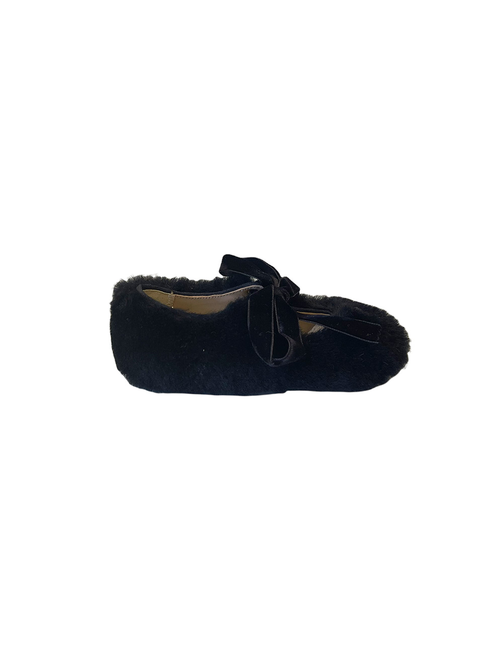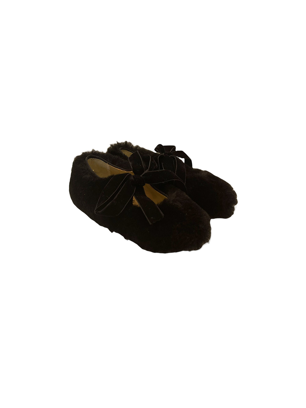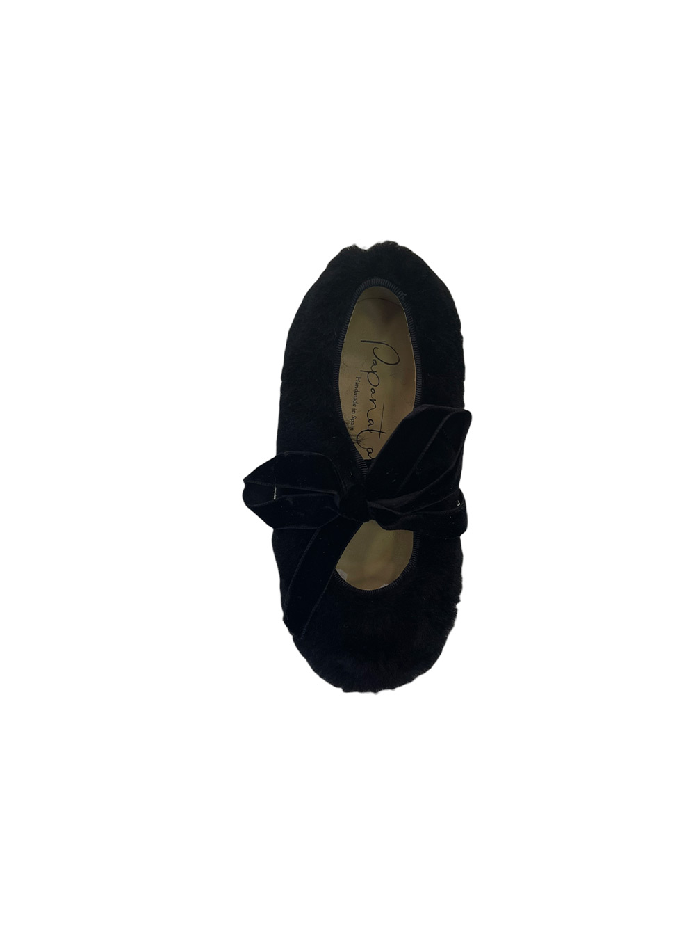Morbide, ecopelliccia nera. Suola in gomma, punta tonda. Fiocco.