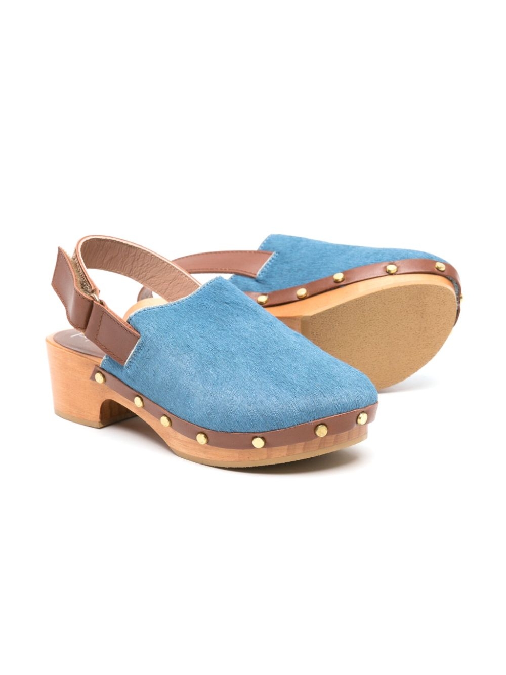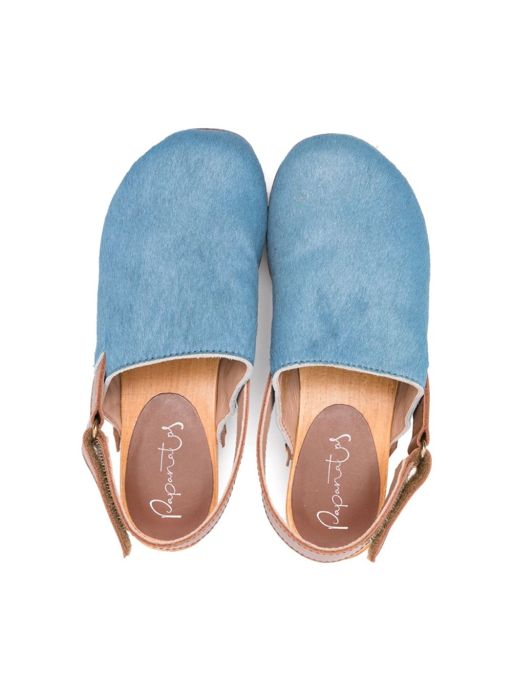 Zoccolo della collezione PAPANATAS. Suola in legno di prima qualità con gomma antiscivolo. Chiusura con fibbia. Colore jeans.