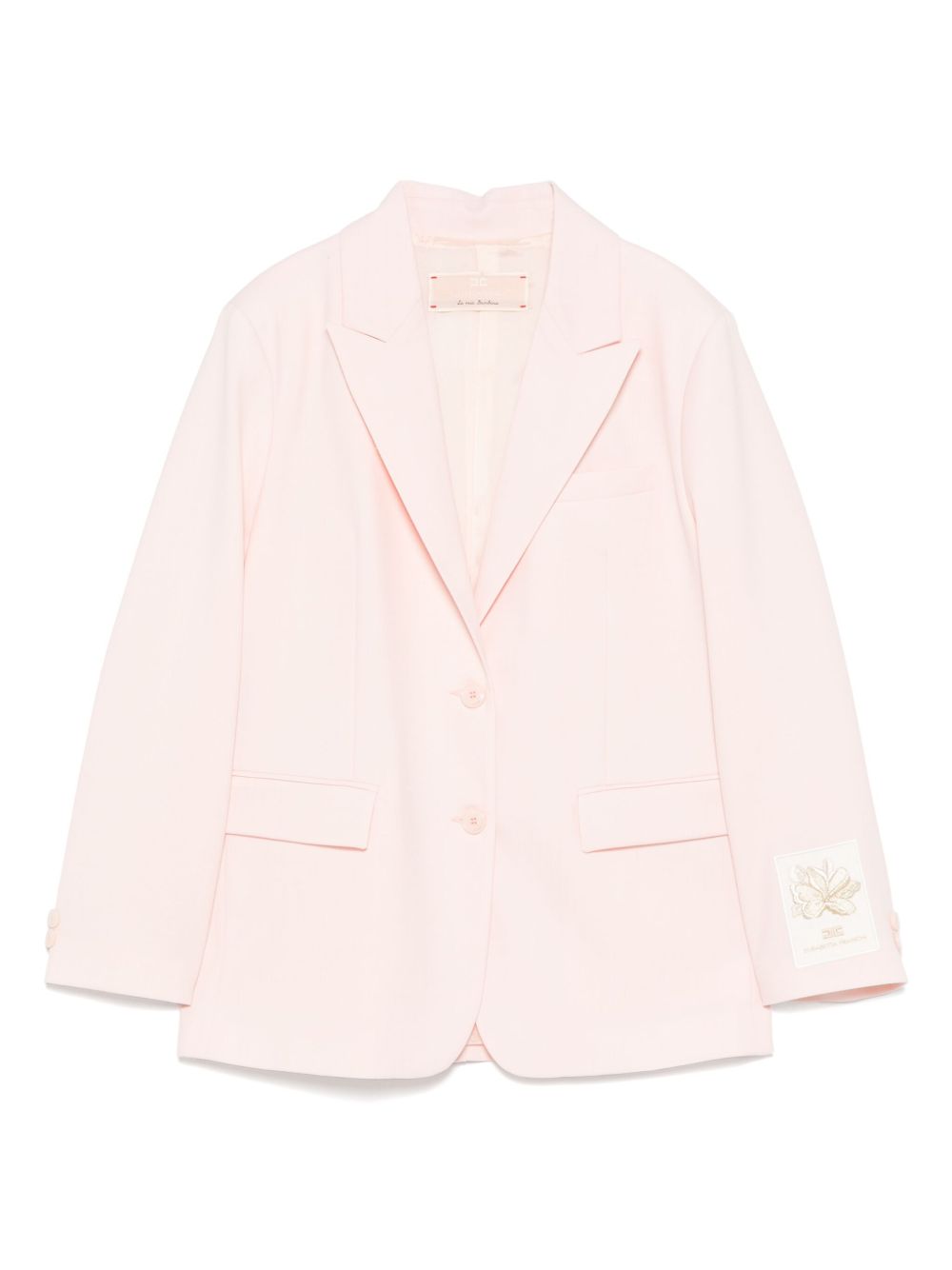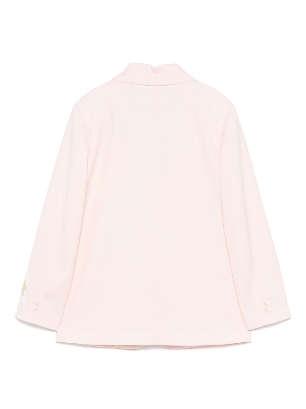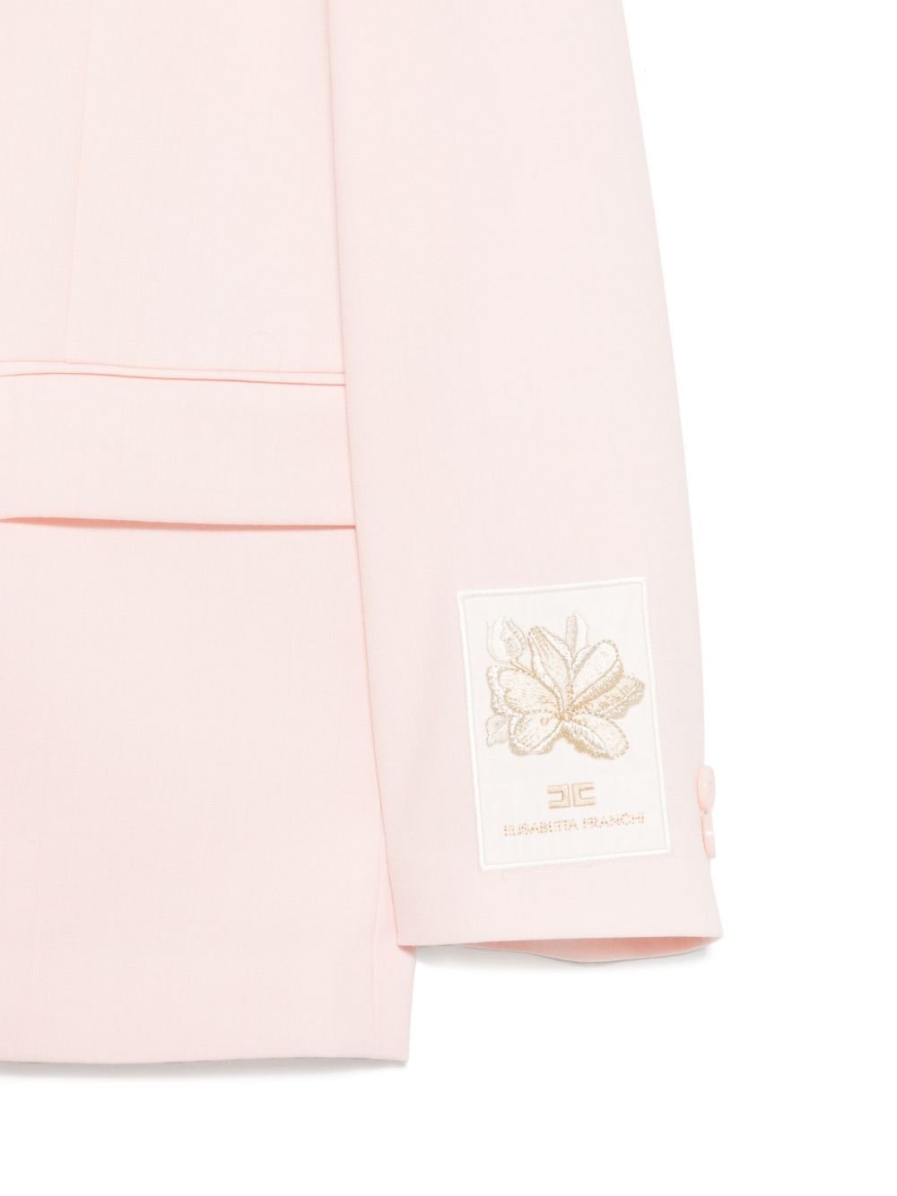 chiusura frontale con bottoni rosa chiaro, tasca a filetto sul petto, due tasche laterali con patta, toppa con logo sulla manica