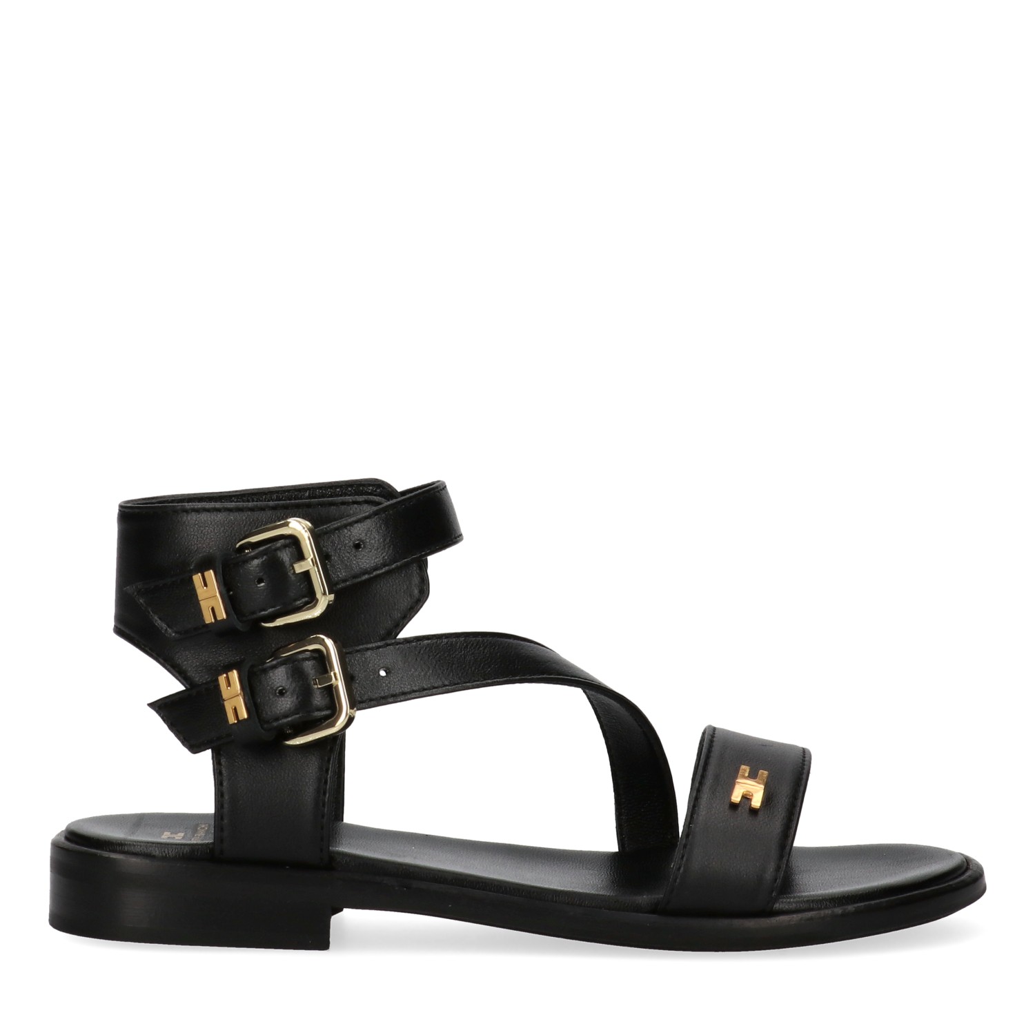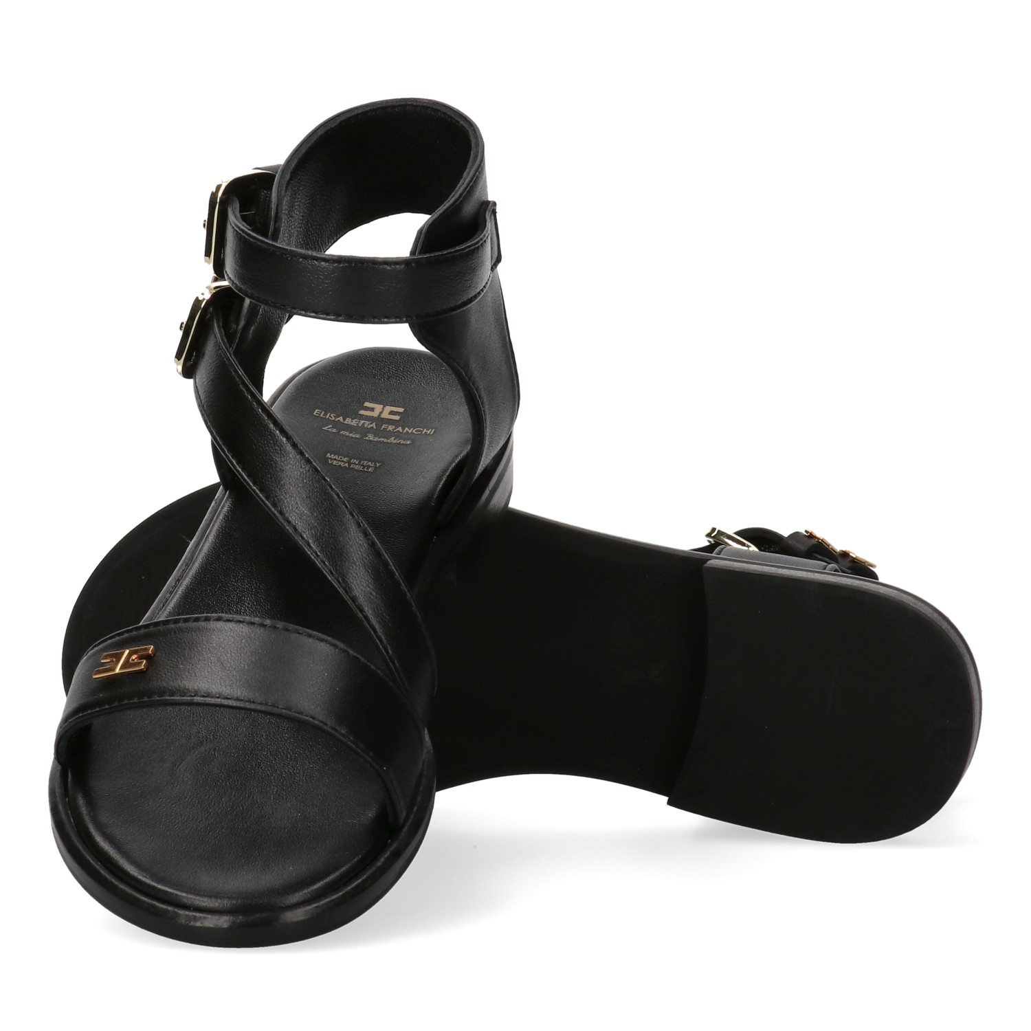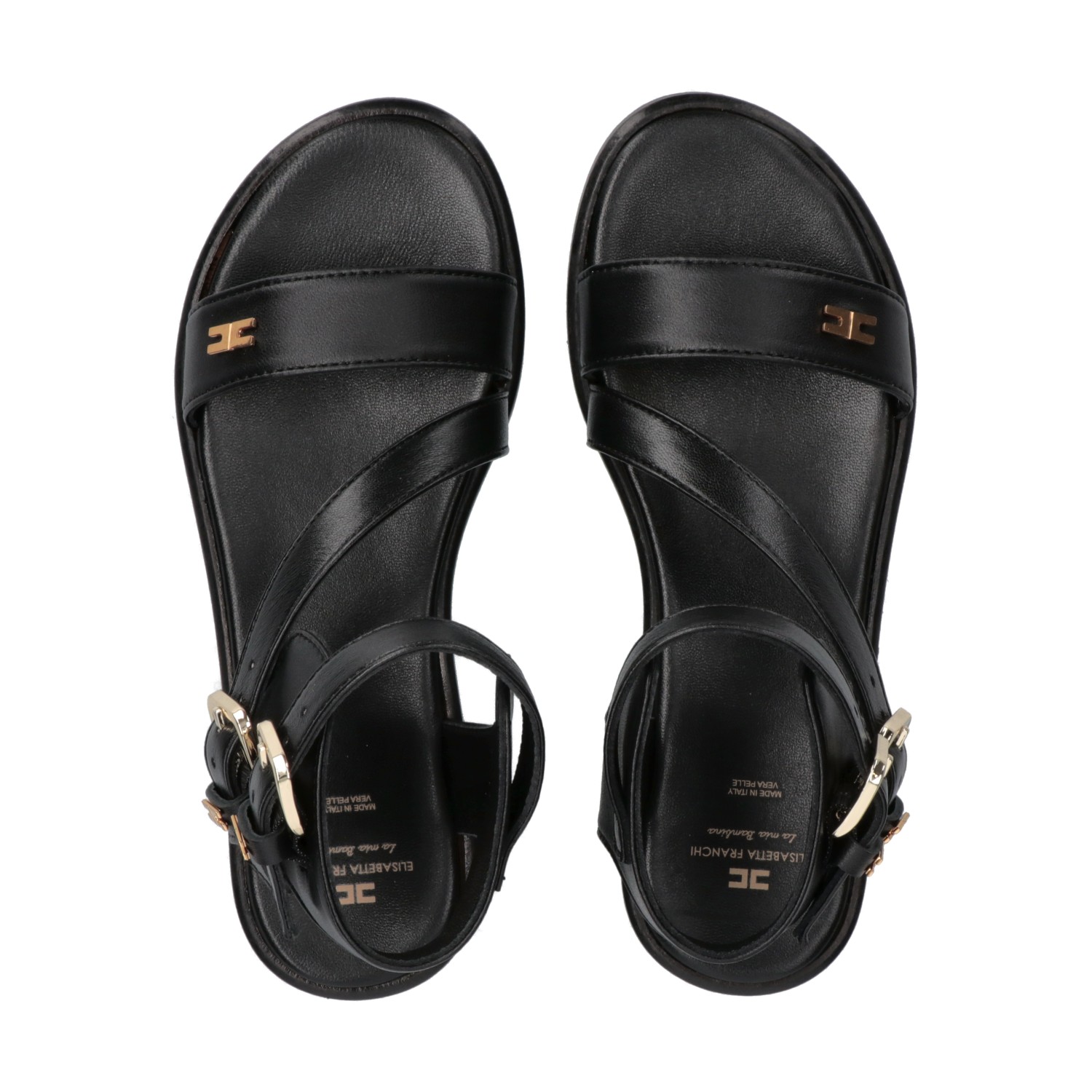 Sandali neri con applicazione logo sul davanti, chiusura con doppia fibbia alla caviglia