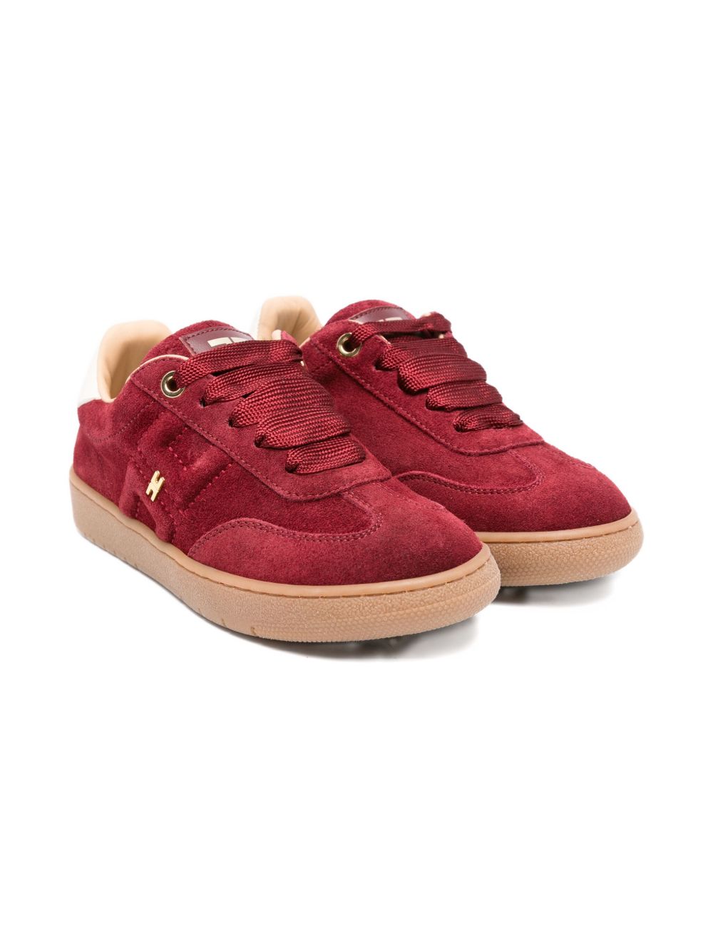 Sneakers in camoscio con logo applicato in oro lateralmente, chiusura con lacci