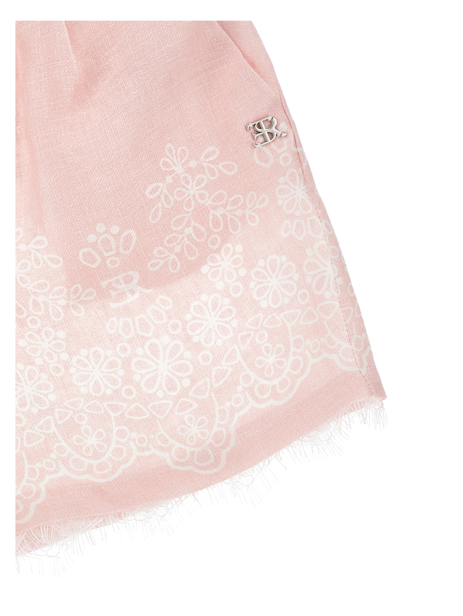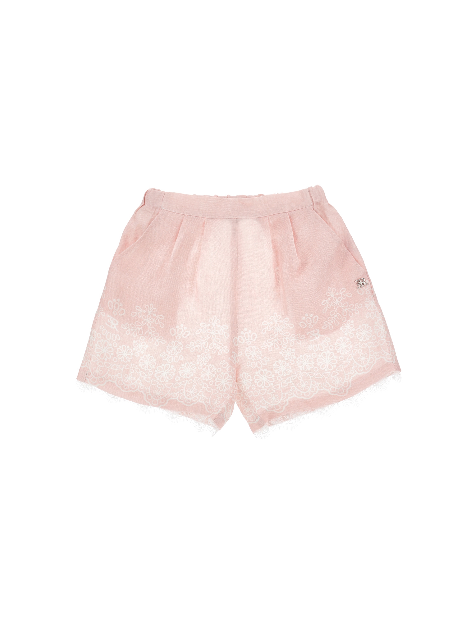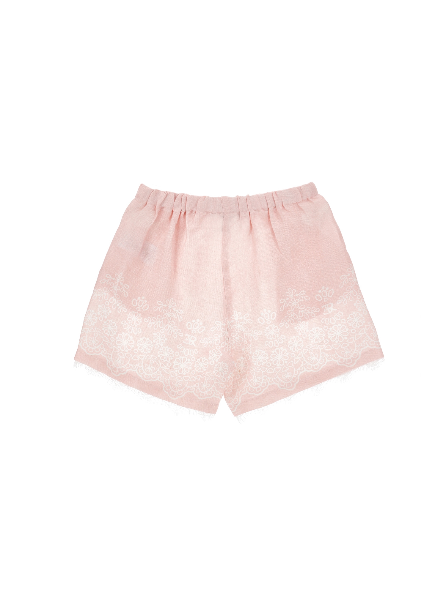 Shorts rosa con ricamo, dettaglio in pizzo elastico in vita e logo cucito