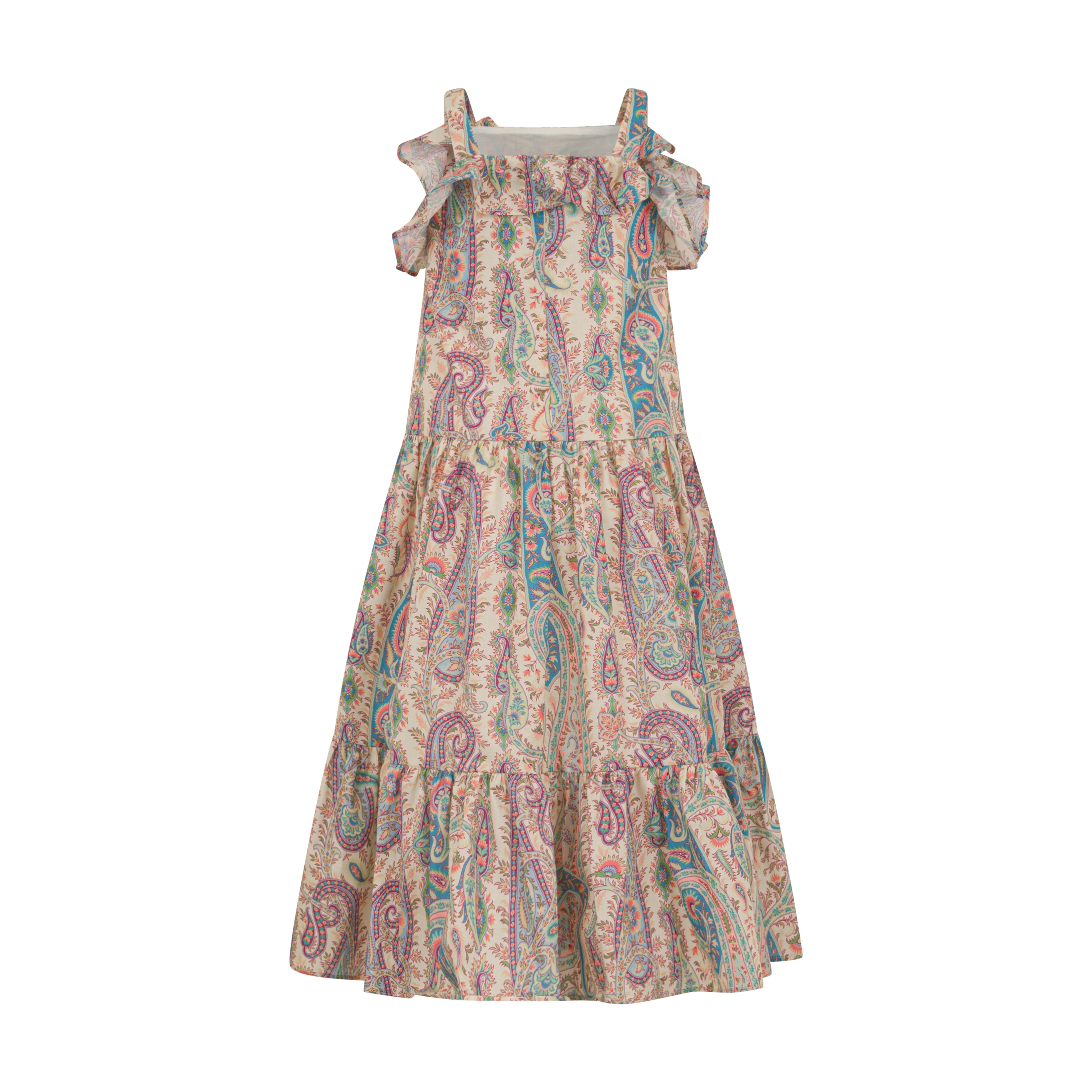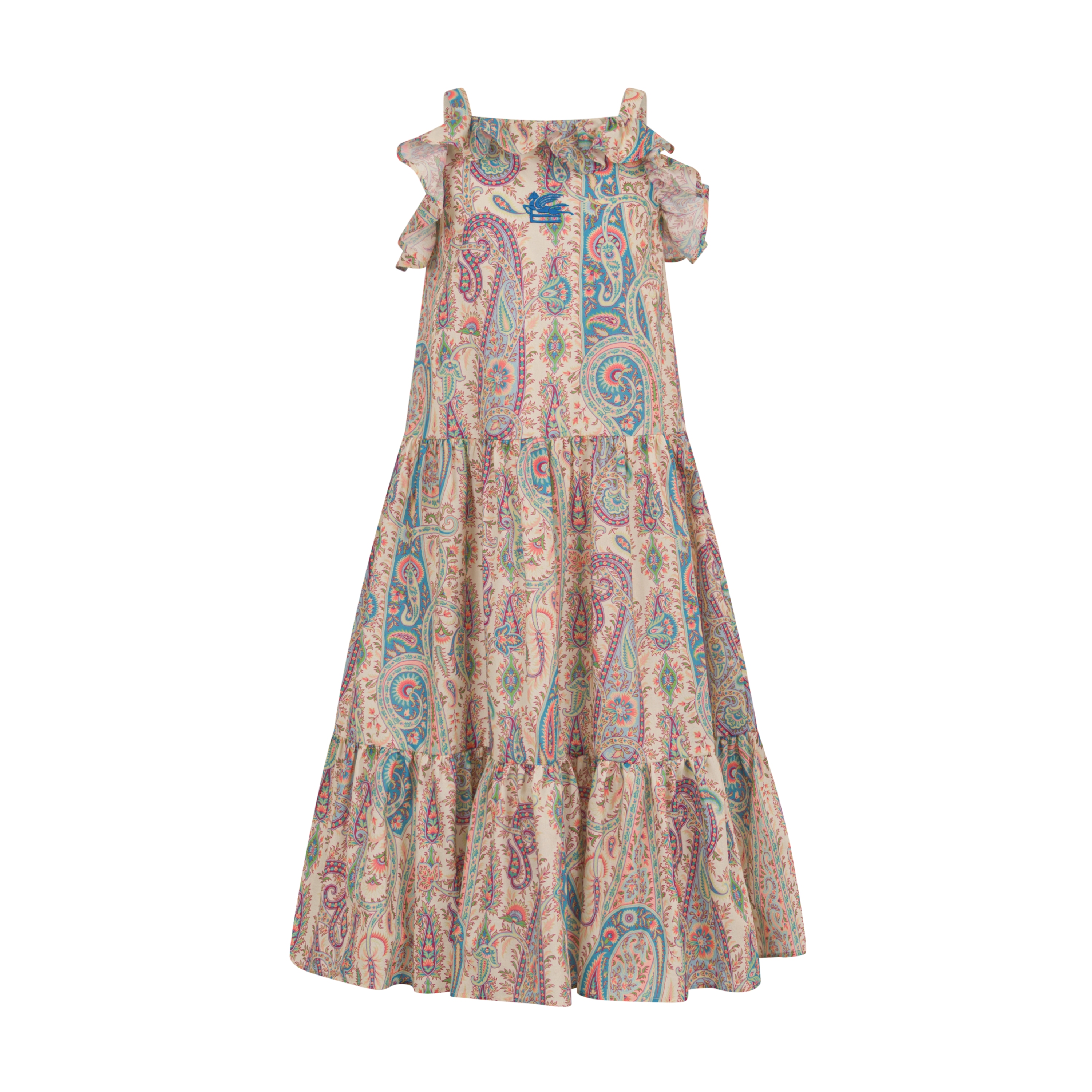 Abito lungo con spalline realizzato in mussola di puro cotone e caratterizzato da una stampa con Paisley all over. Il modello si distingue per lo scollo dritto con volant su davanti e retro, e per la gonna con morbide pieghe e balza sul fondo. Al centro del petto spicca il ricamo a contrasto con logo Pegaso e monogram ETRO.