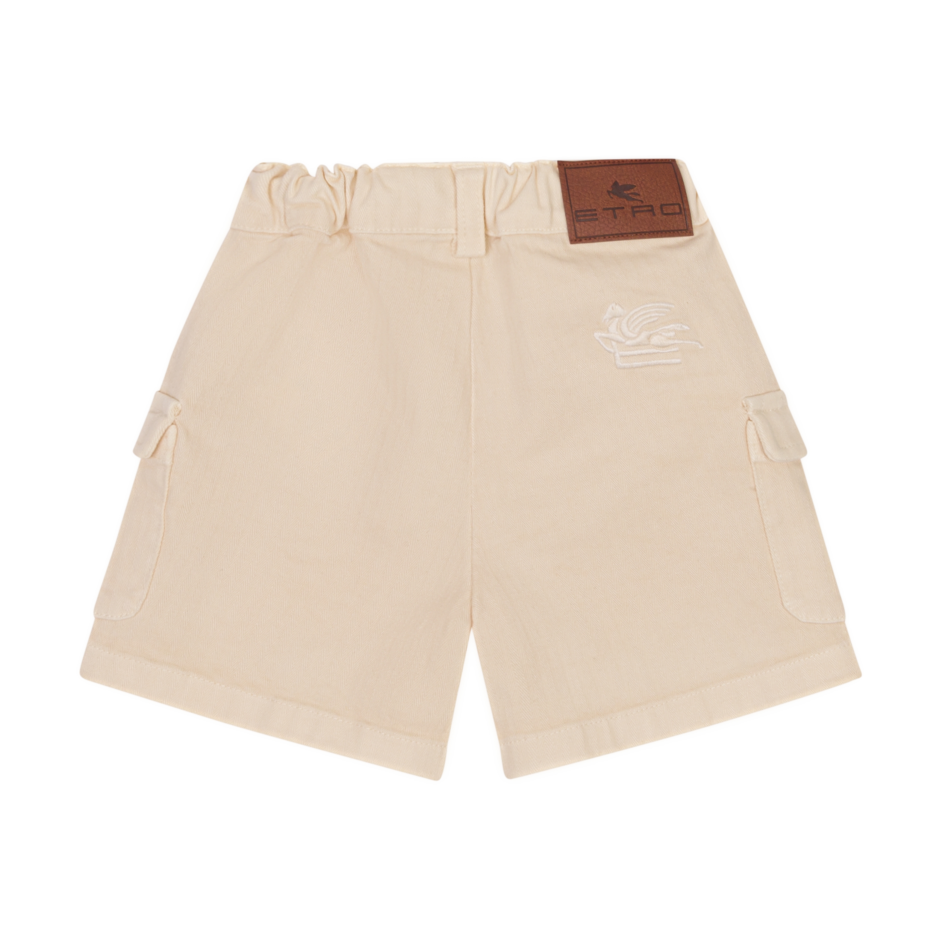 Shorts stile cargo realizzati in cotone stretch con trama a spina di pesce. Il modello presenta due tasche frontali e due tasche utility con patta sulle gambe, ed è rifinito sul retro da una salpa con logo Pegaso e lettering ETRO e da un ricamo in tono con Pegaso e monogram ETRO.
