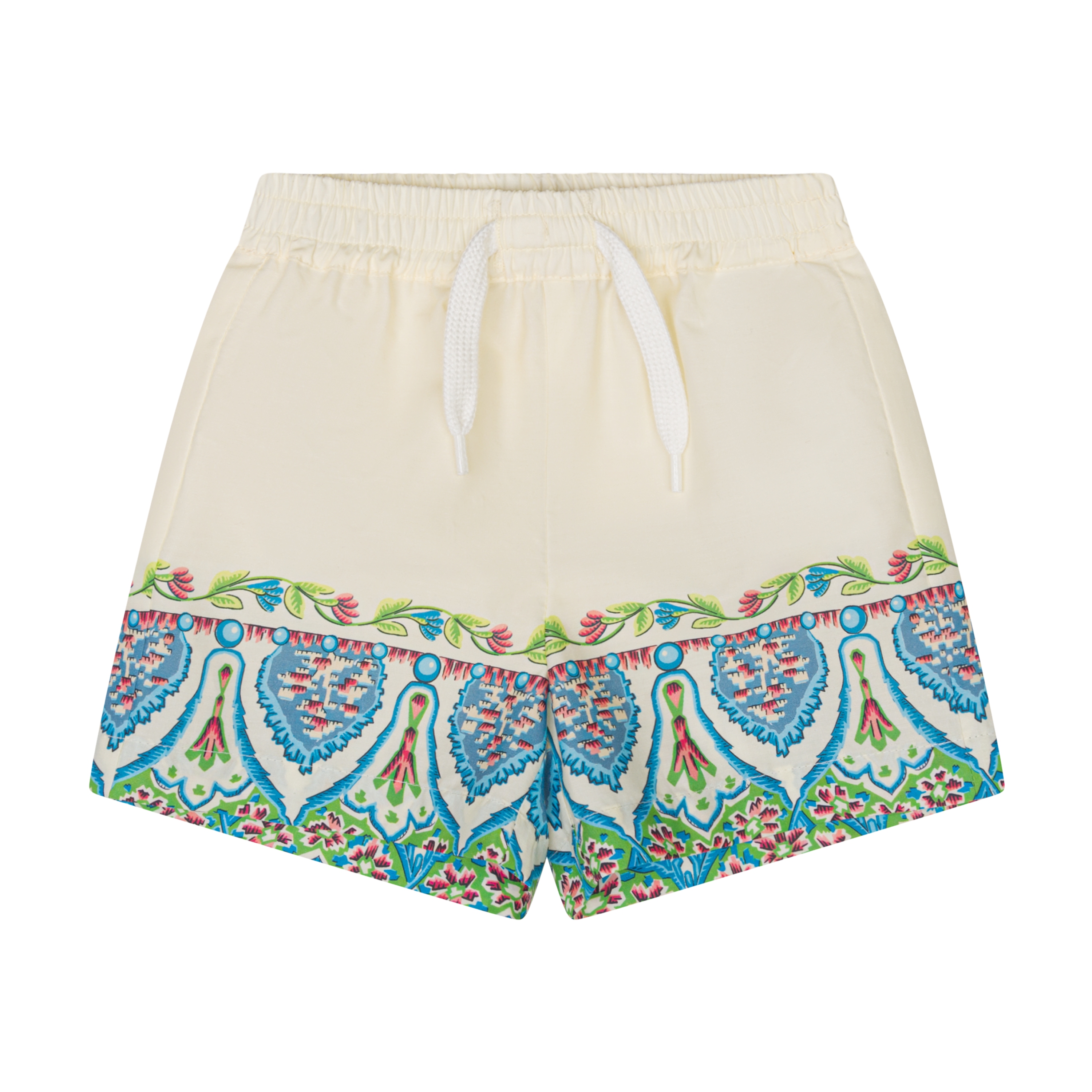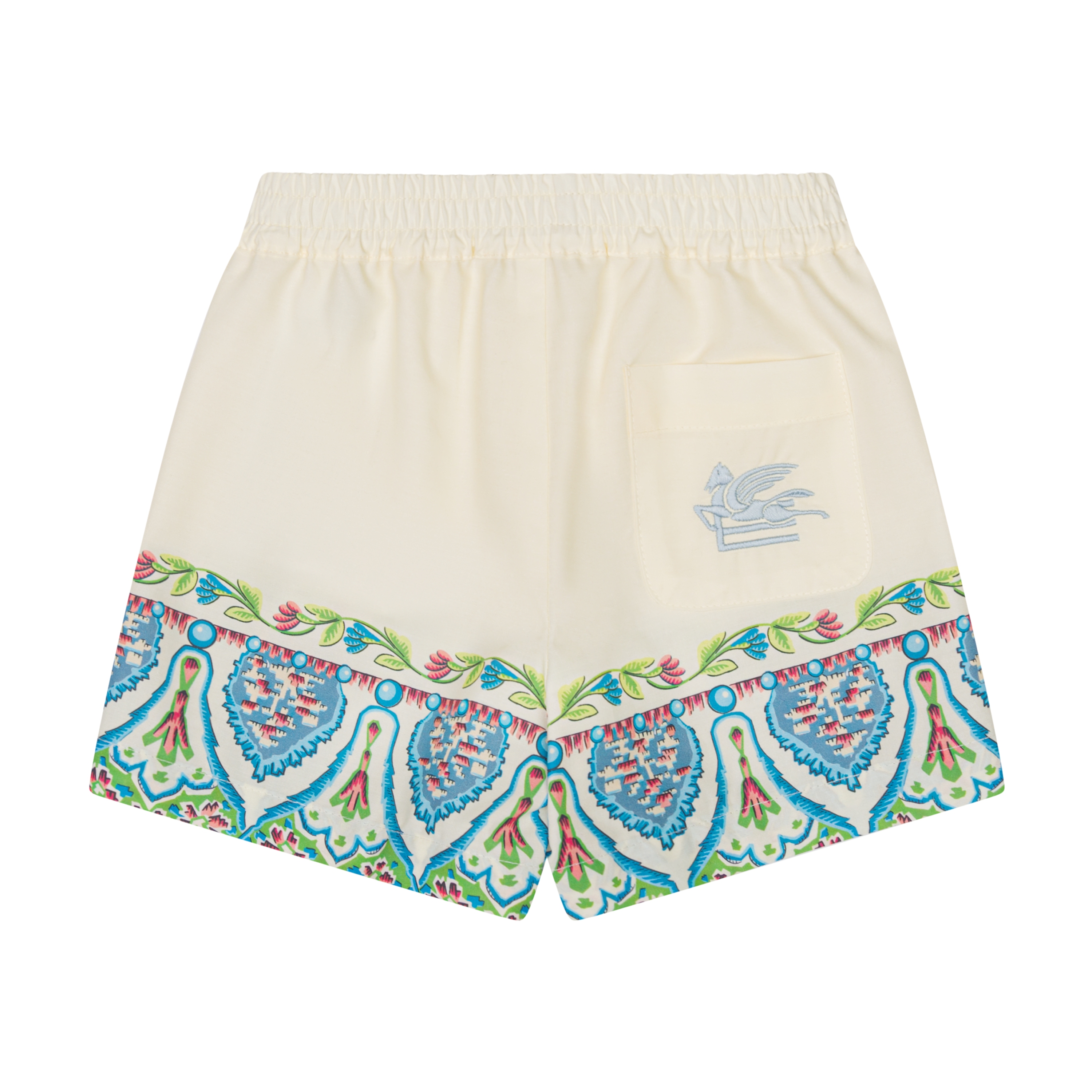 Bermuda in popeline di puro cotone caratterizzati da una stampa piazzata con motivo a medaglioni e fantasia floreale. Il modello è completato da una tasca applicata sul retro con logo Pegaso e monogram ETRO ricamati.