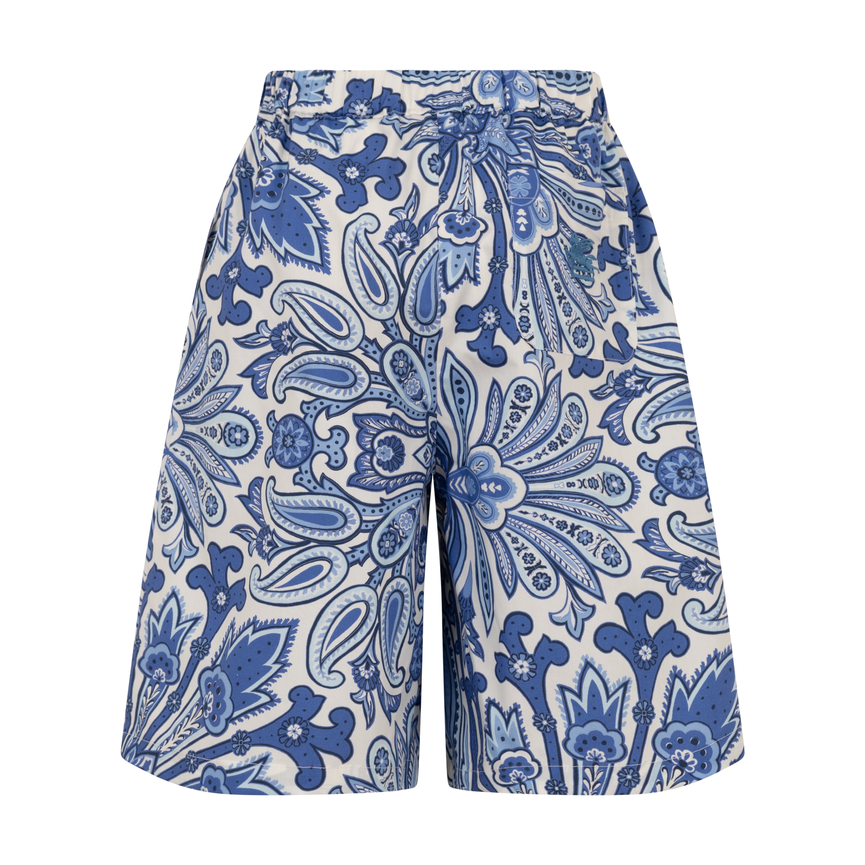 Bermuda realizzati in popeline di puro cotone e caratterizzati da una maxi stampa Paisley floreale d'ispirazione foulard. Il modello è completato da una tasca applicata sul retro con logo Pegaso e monogram ETRO ricamati.