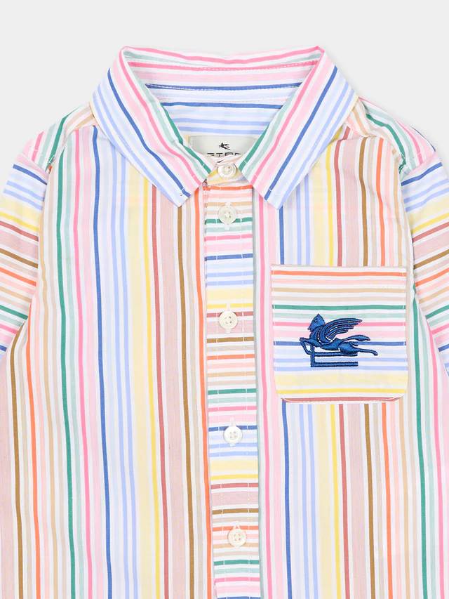 Camicia multicolor a righe, realizzata in popeline di cotone, a maniche lunghe, con colletto a punta, chiusura frontale con bottoni e taschino sul petto. È decorata con Pegaso ricamato sul petto.