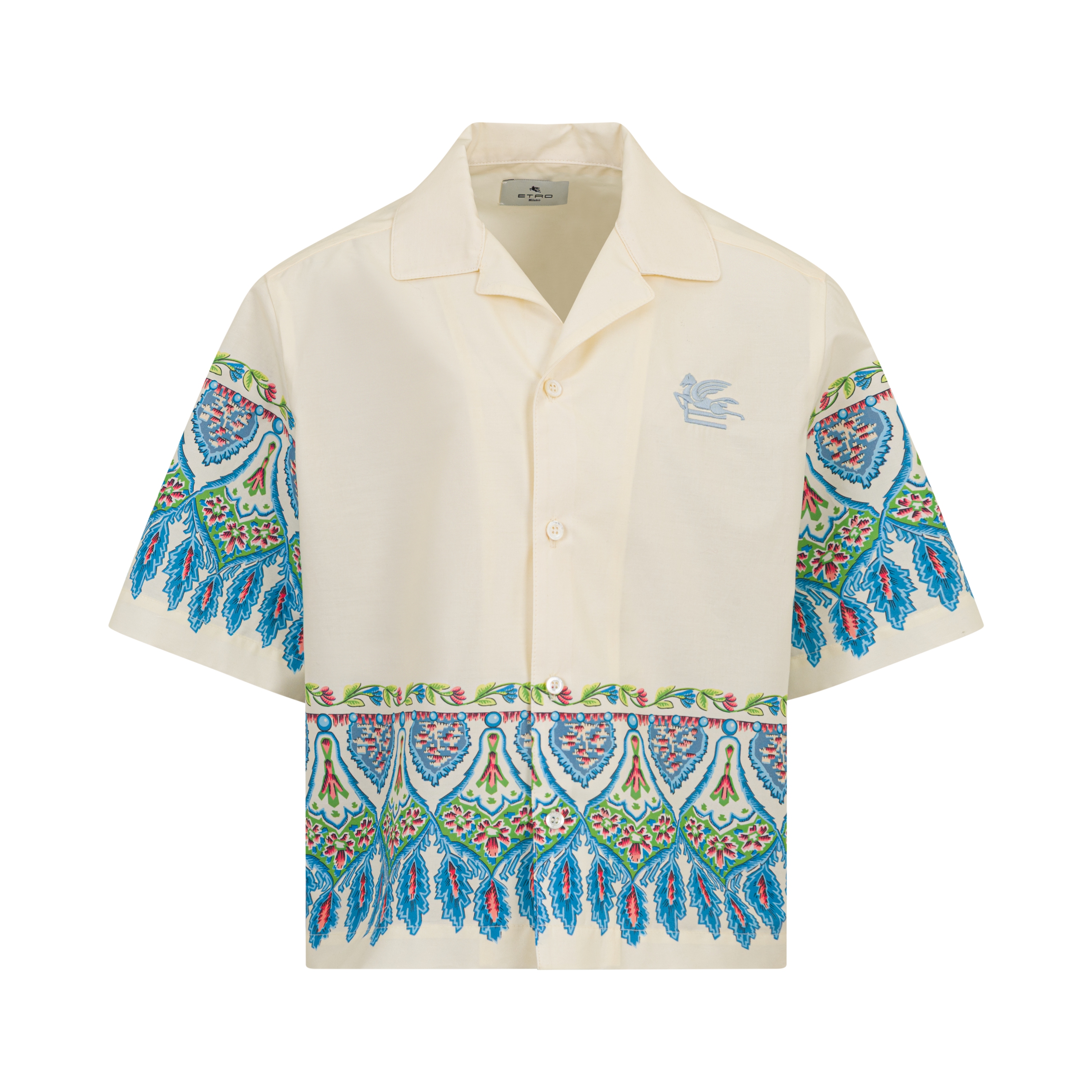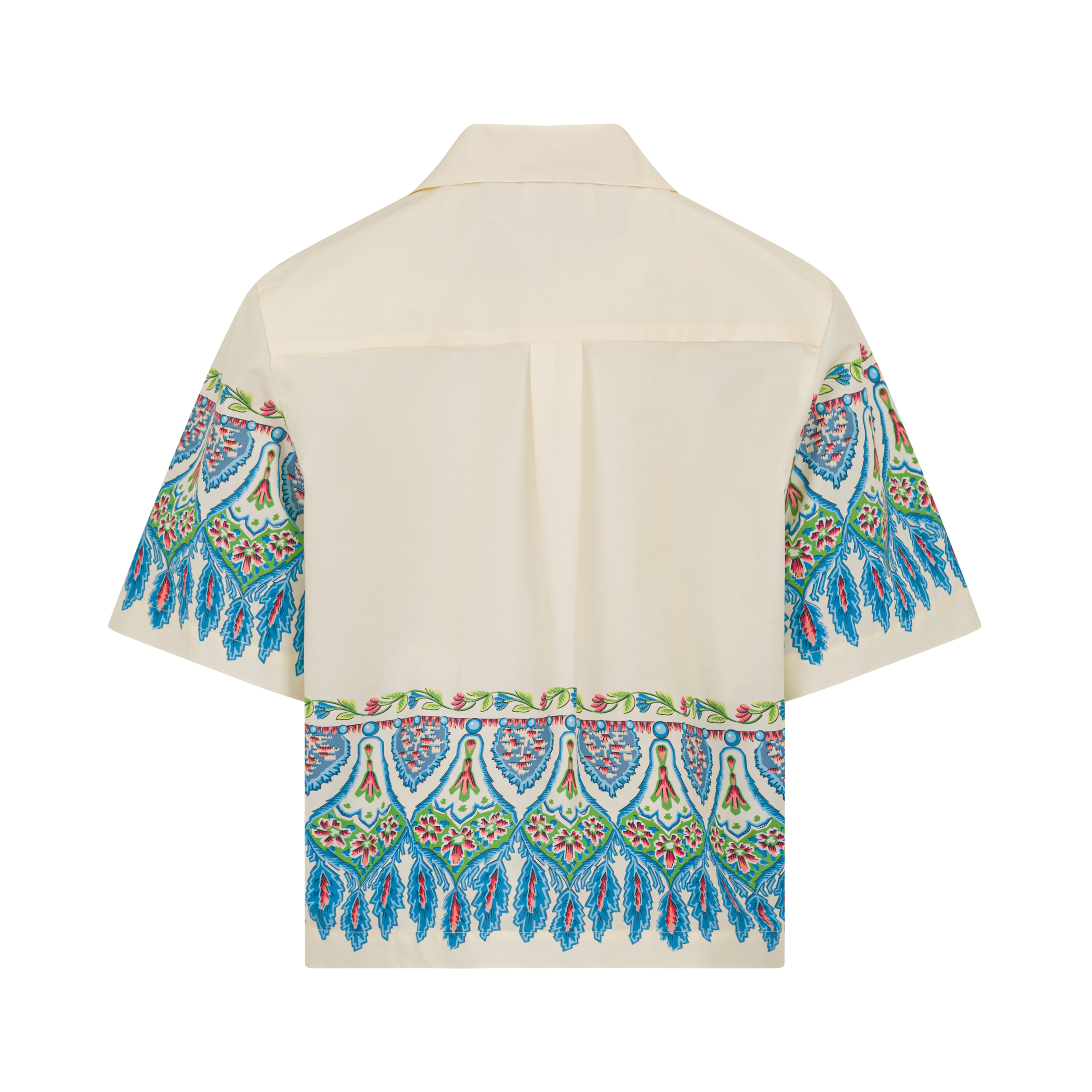 Camicia avorio in popeline di cotone, a maniche corte, con colletto a revers e chiusura frontale con bottoni. È decorata con Pegaso ricamato sul petto e con stampa floreale sulle maniche e sul fondo.