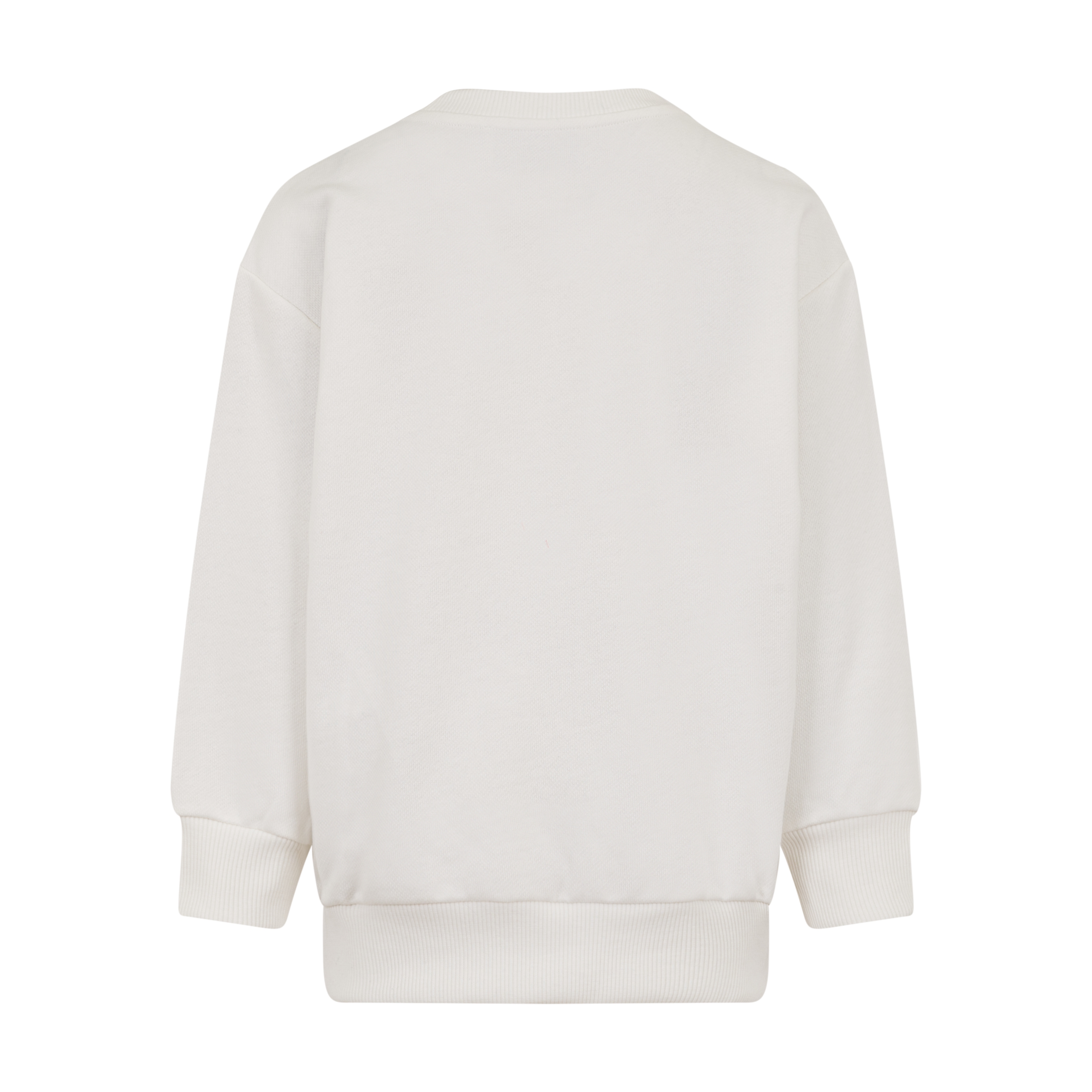 Felpa avorio in cotone garzato, a maniche lunghe, con girocollo, polsini e orlo a costine. È decorata con logo e Pegaso ricamati, realizzati con scampoli diversi di tessuto con le stampe emblematiche del brand
