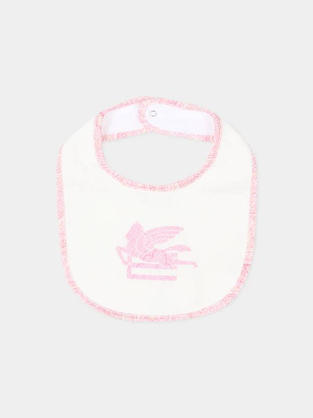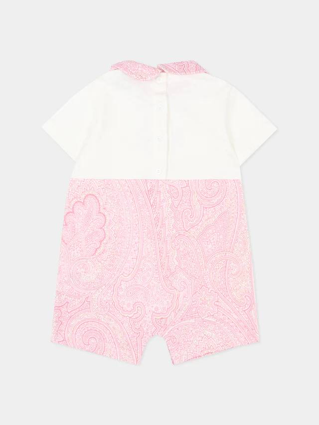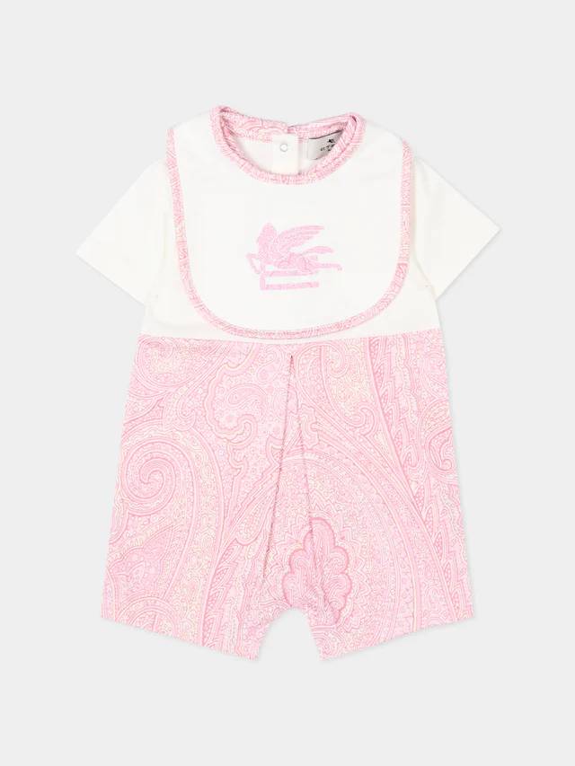 Set tutina in jersey di cotone composto da tutina corta e bavaglino coordinato. La parte superiore in tinta unita avorio è decorata dal logo Pegaso ricamato in rosa, mentre il colletto e il bavaglino presentano profili a contrasto che riprendono il motivo paisley iconico del brand. Il fondo della tutina è interamente animato da una delicata stampa paisley rosa, con bottoncini sul retro e fra le gambe che facilitano il cambio.