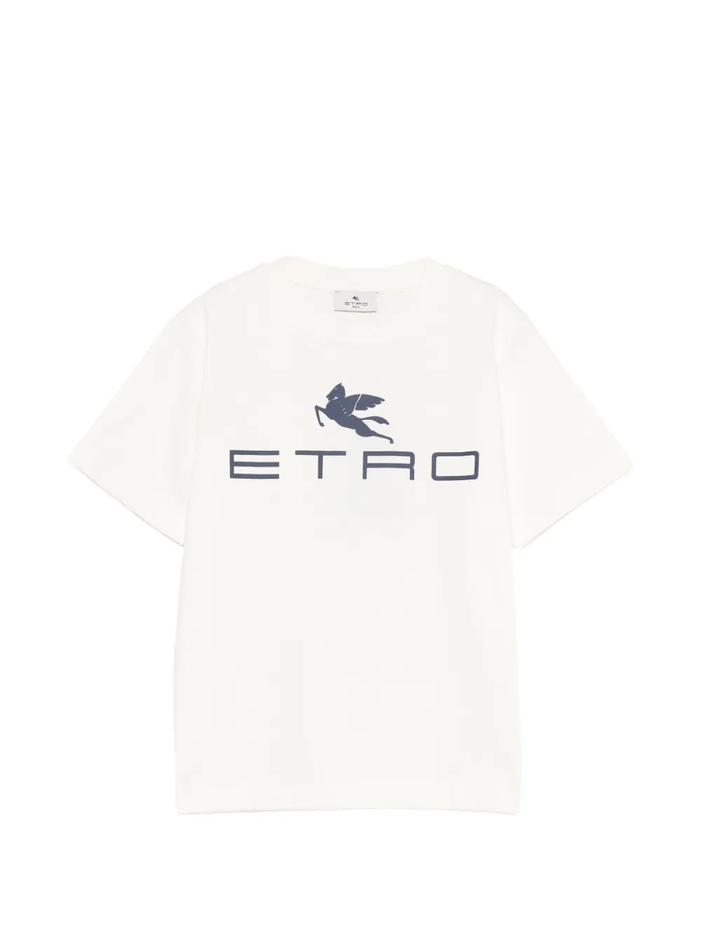 T-shirt panna realizzata in jersey di cotone, con maniche corte e girocollo a costine. È decorata con stampa Pegaso e logo, sulla parte anteriore.