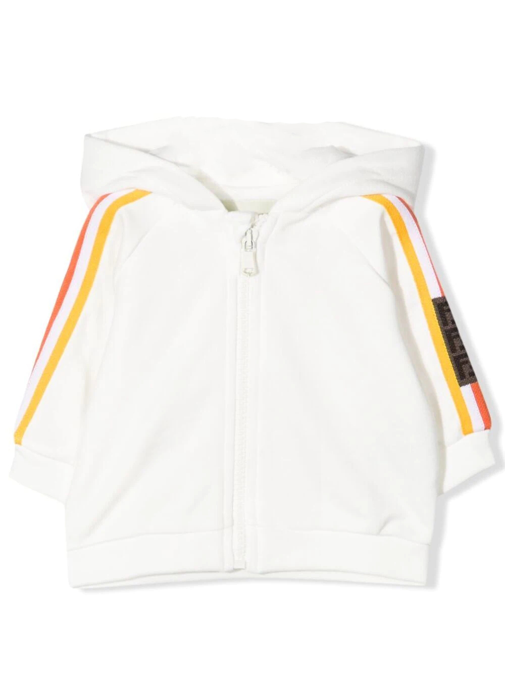 Cappuccio, chiusura frontale con zip, maniche lunghe, dettaglio laterale a righe e stampa con monogramma. Colore: bianco.