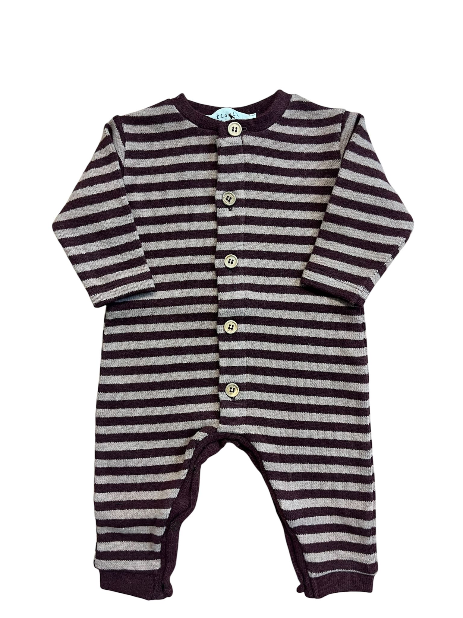 Tutina a righe bordeaux , con chiusura sul davanti con bottoni