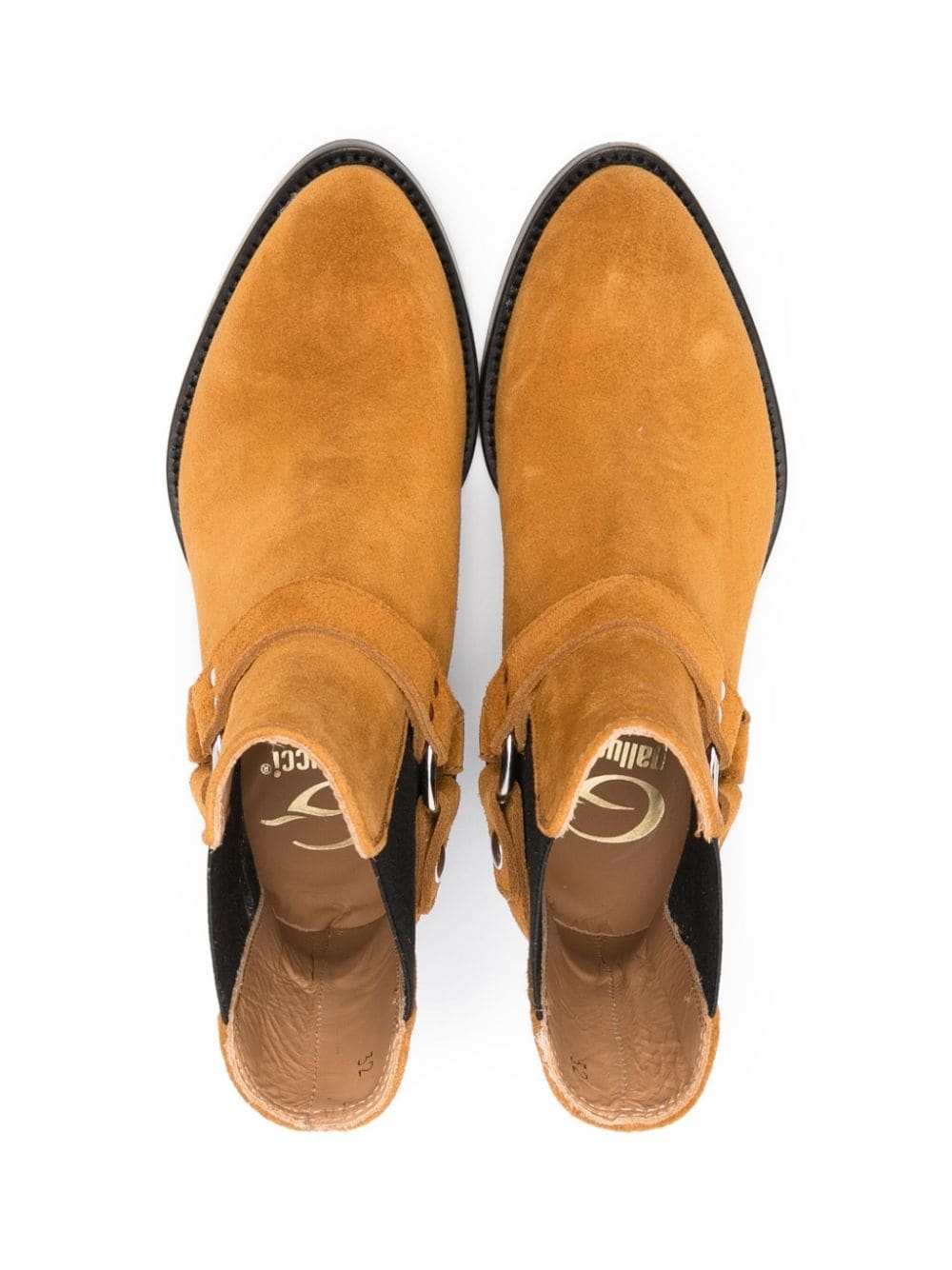 Marrone cammello, pelle di vitello, camoscio, pannelli elastici laterali, dettagli color argento, punta smussata, lunghezza alla caviglia, soletta con logo e tacco largo basso.