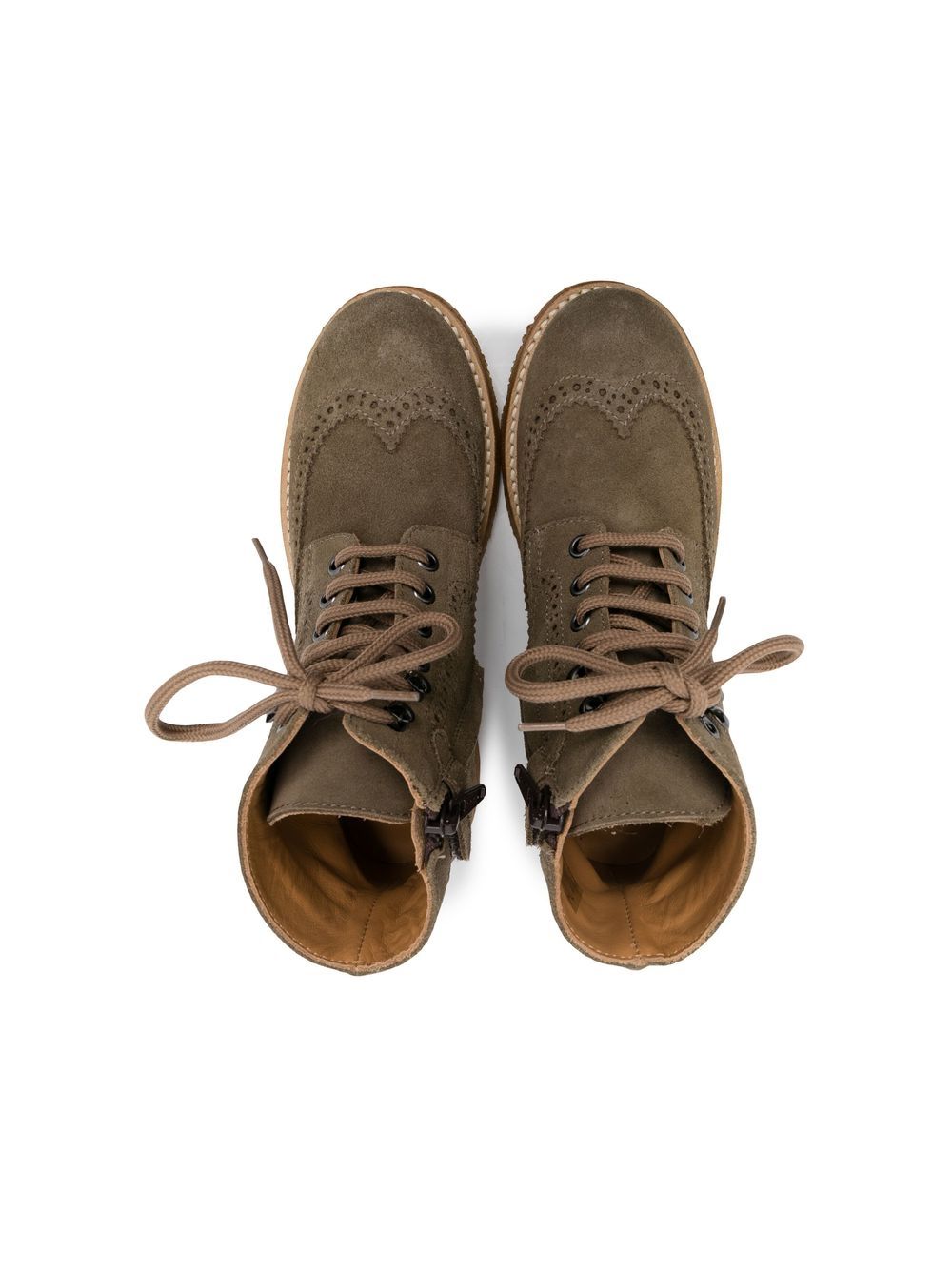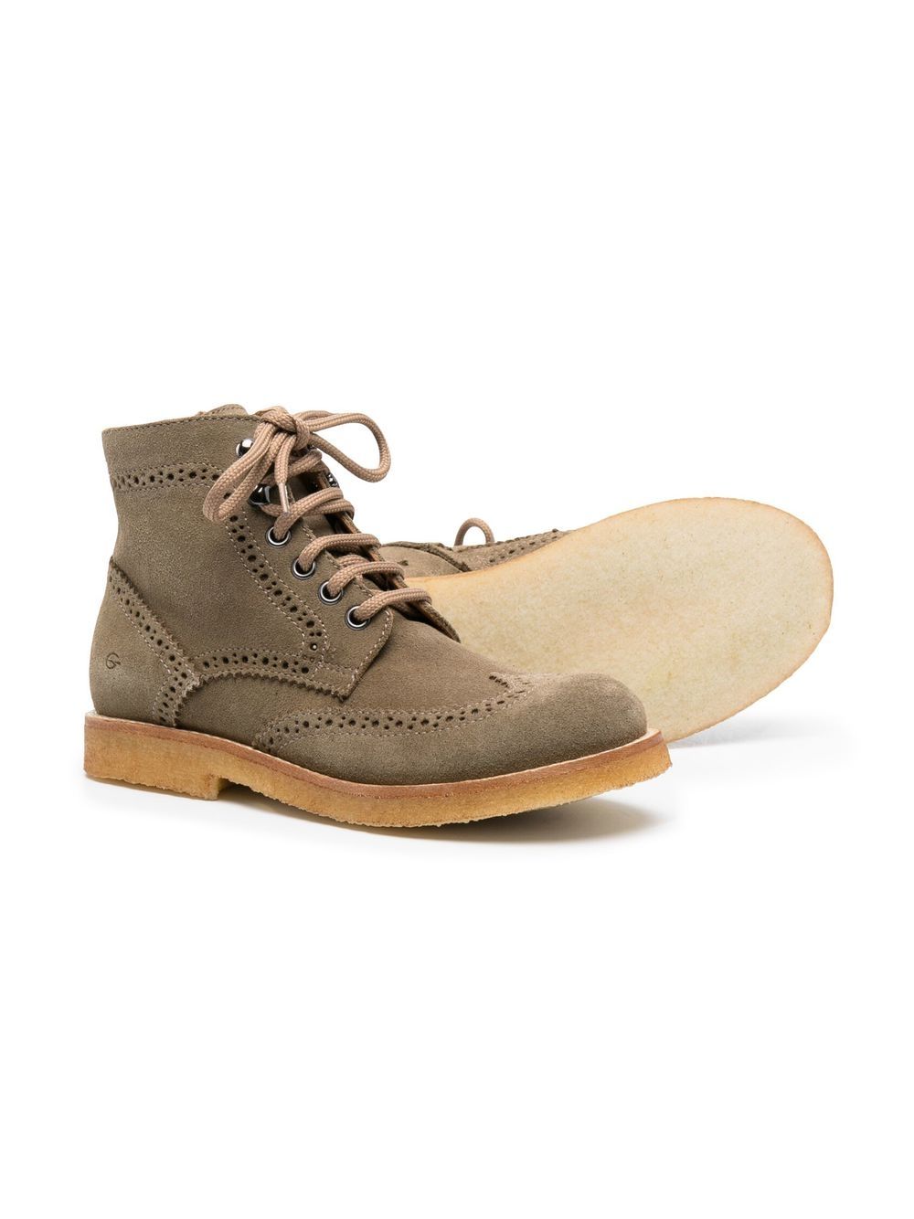 Stivaletti stringati in pelle scamosciata, beige scuro, suola in gomma crepe, punta tonda e chiusura con lacci.