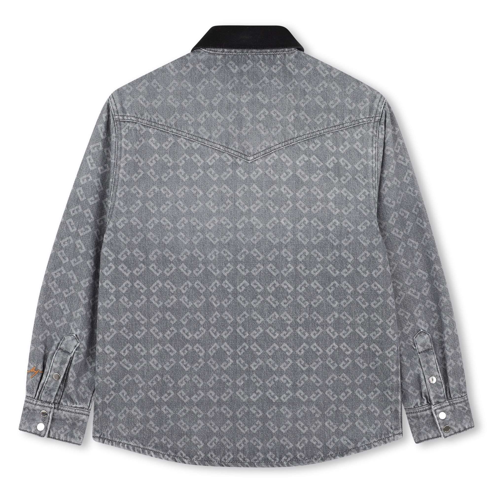 Camicia con logo e stampa all over in dneim grigio con tasche sul davanti colletto a contrasto e logo cucito sulla manica.