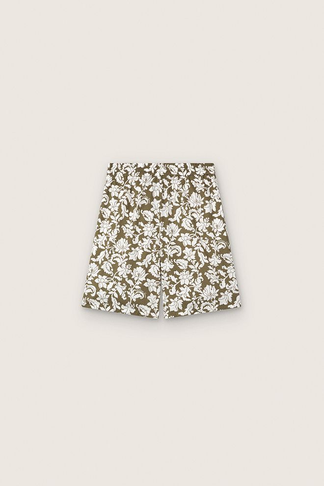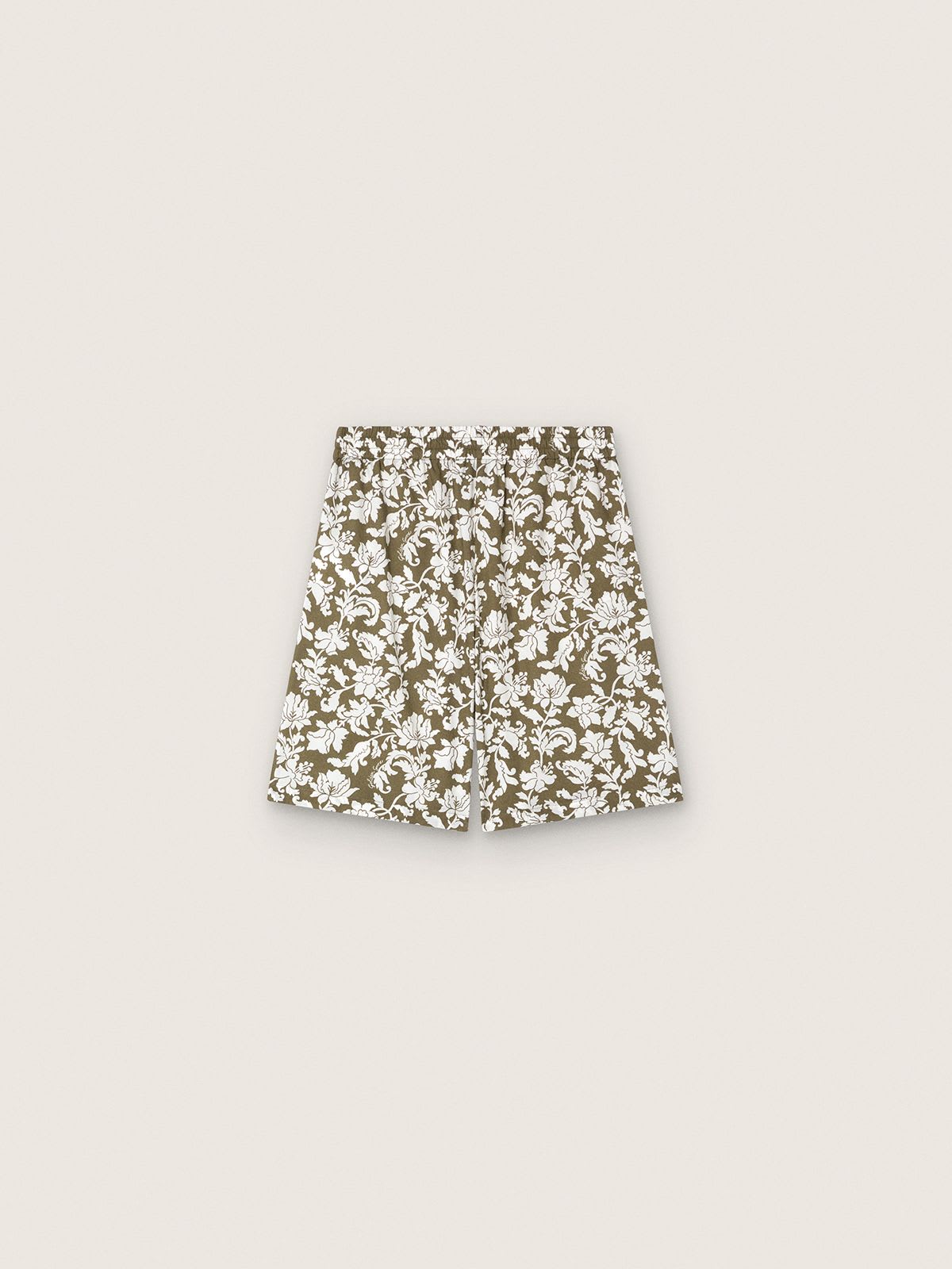 Bermuda con stampa, fonso verde militare, stampa a fiori.Tasche a filetto sui lati
