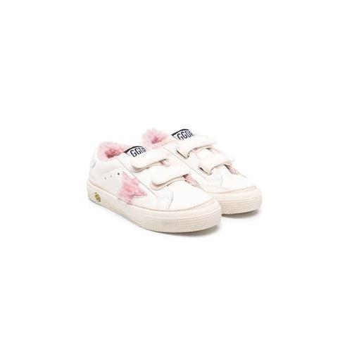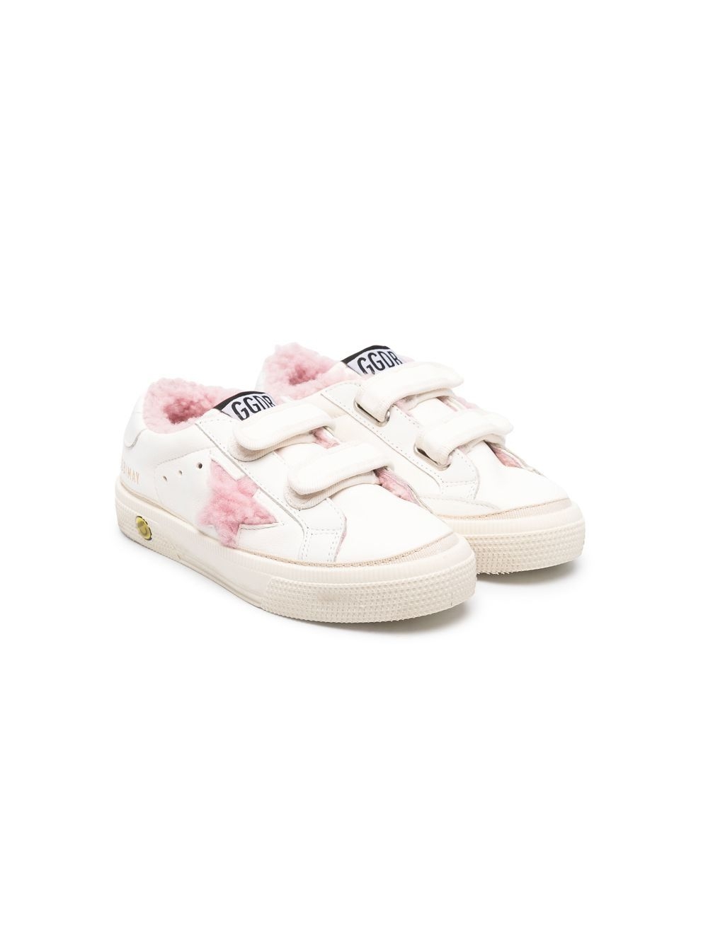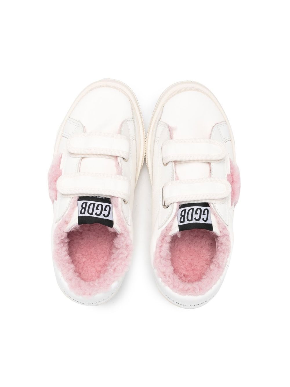 Bianco, rosa blush, interno in Shearling, stella in shearling, caratteristica applicazione laterale a stella, applicazione con logo sulla linguetta e chiusura frontale a strappo.