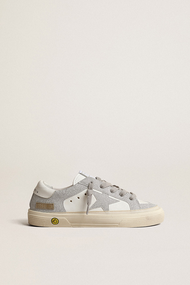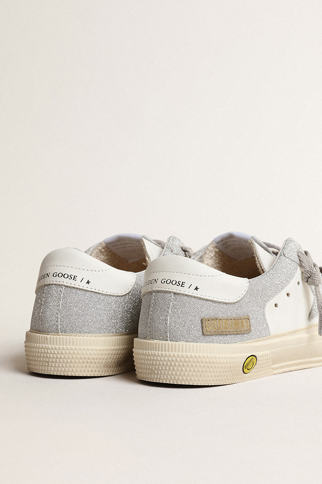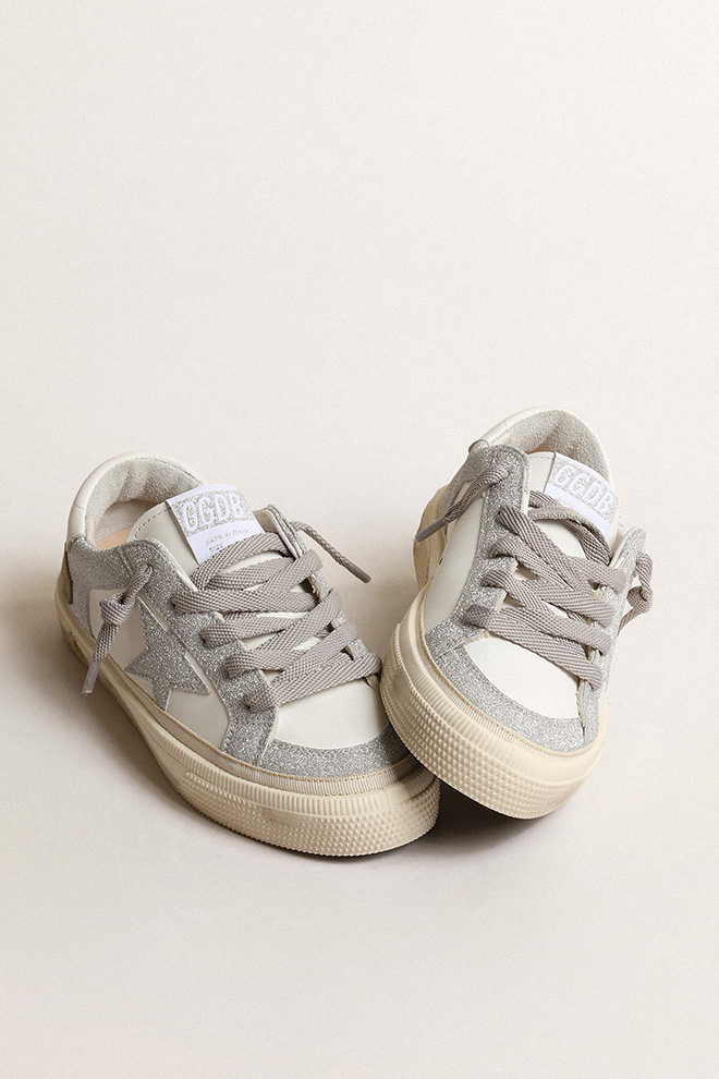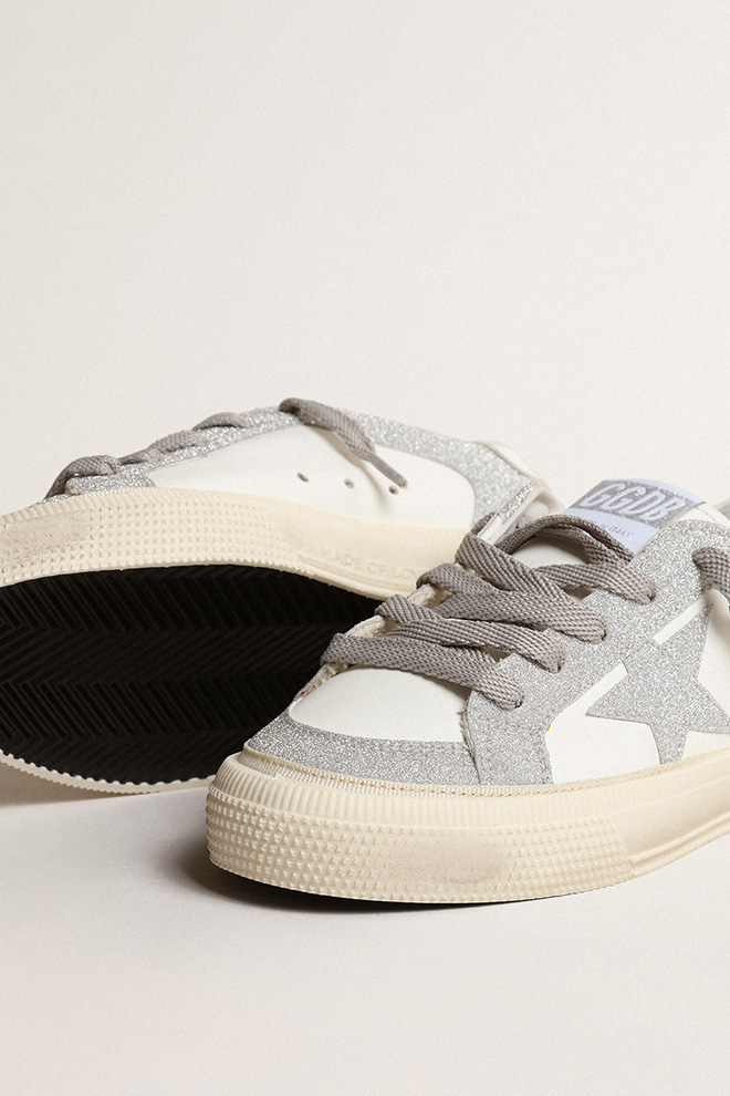 Sneakers bianche con suola in gomma avorio e chiusura con lacci sulla parte superiore. Sono decorate con dettagli argentati, iconica stella argentata laterale e logo sulla parte posteriore.