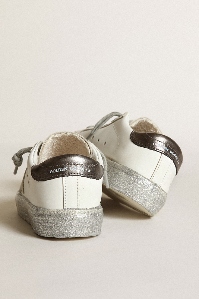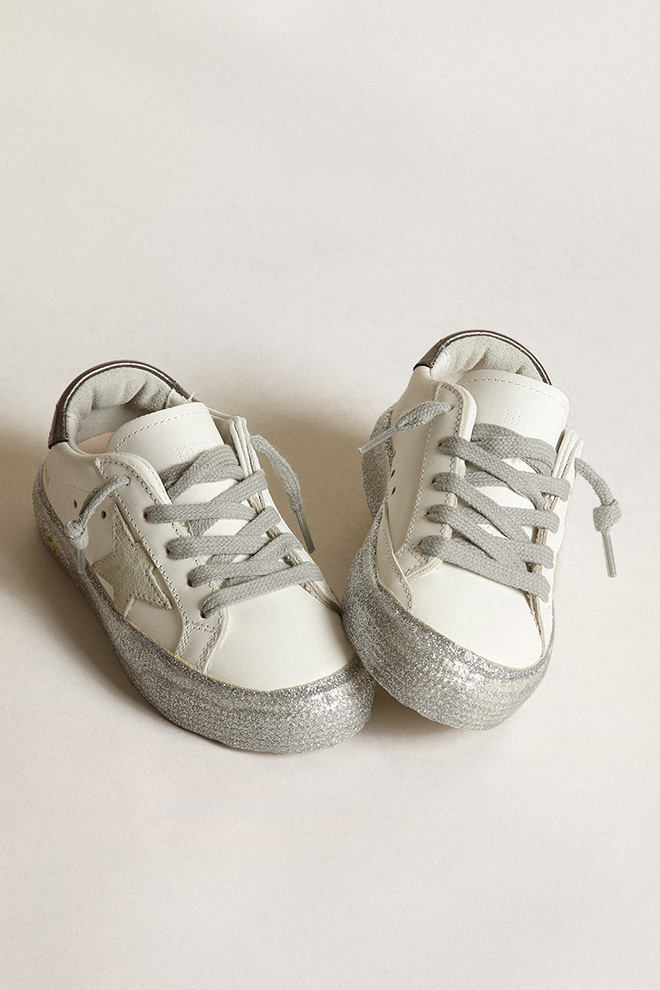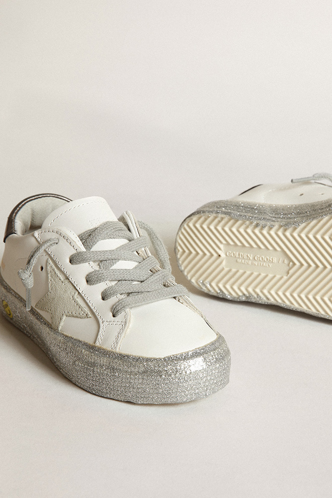 Sneakers May bianca con stella Golden Goose grigia. Chiusura con lacci. Gomma alta argento.