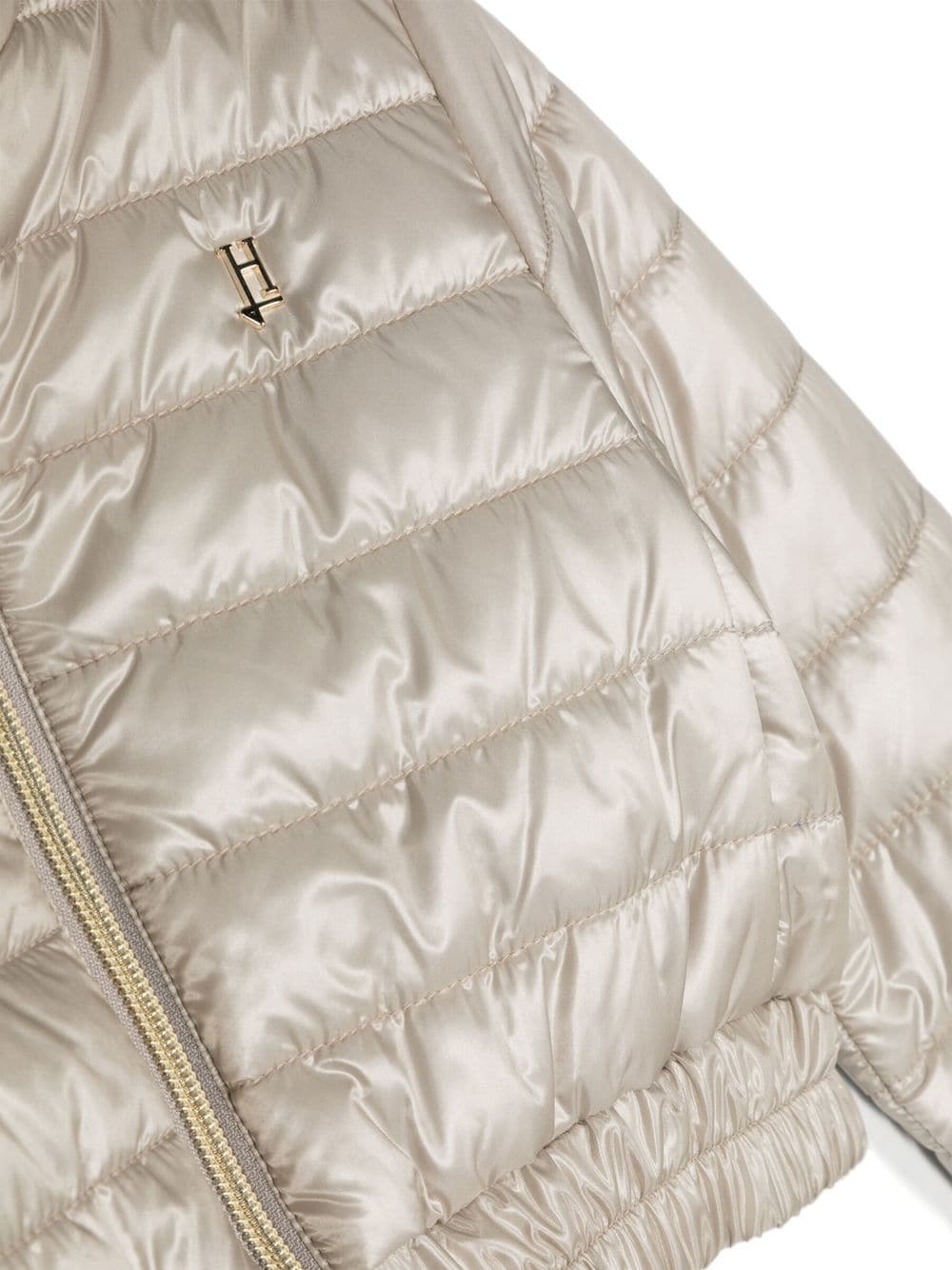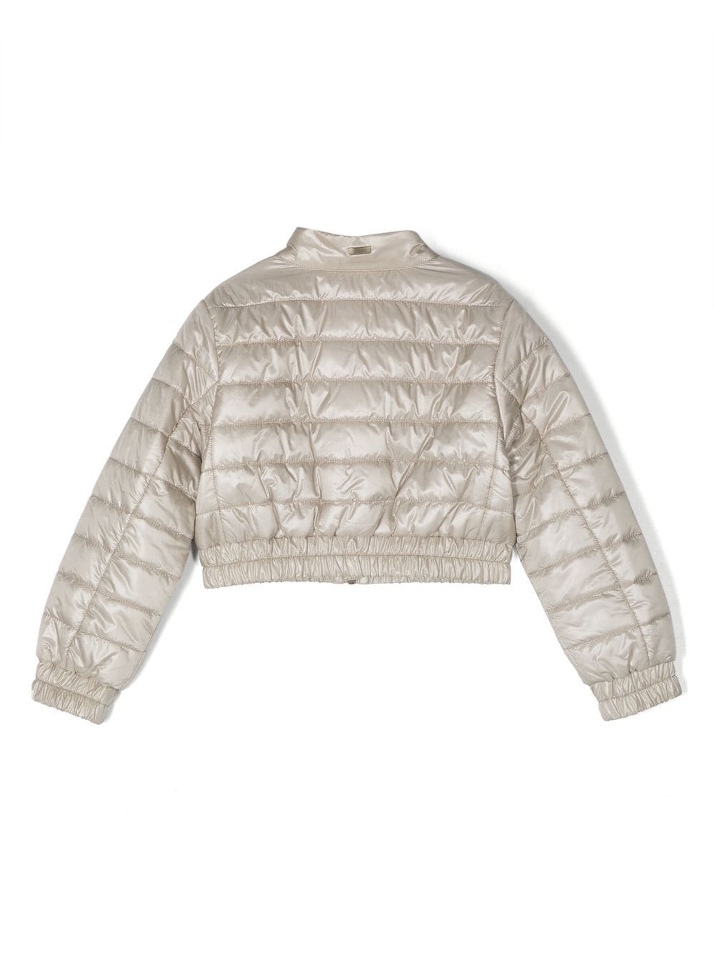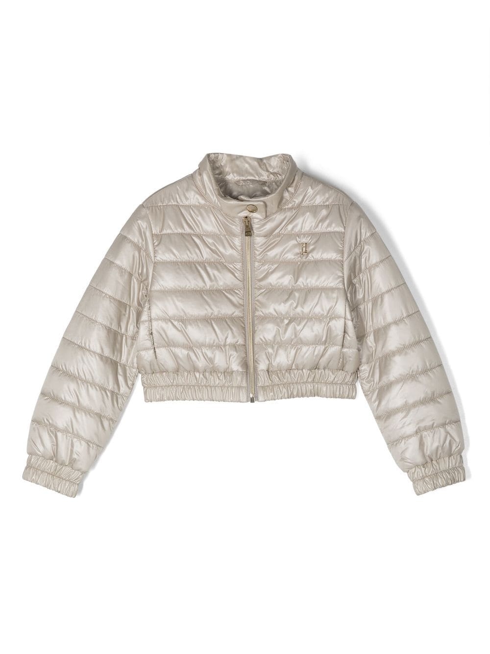 Giubbino corto metallizzato color champagne, placca con logo color oro, collo alto, chiusura frontale con bottone a pressione e zip, maniche lunghe, polsini elasticizzati, orlo elasticizzato e taglio corto.
