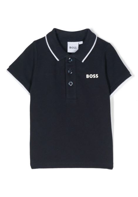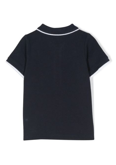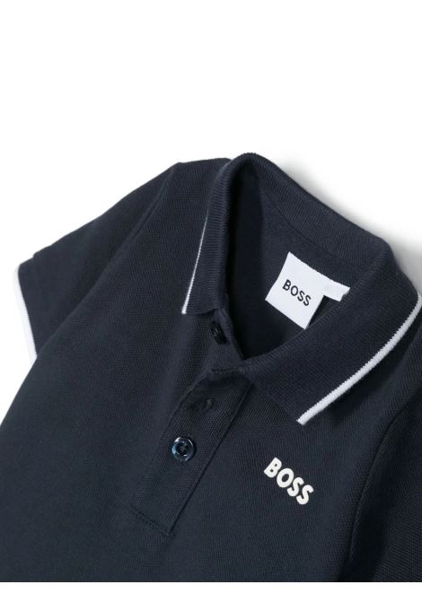 Blu navy, cotone, trama piquet, stampa con logo sul petto, bordo a contrasto, colletto stile polo, maniche corte e orlo dritto.