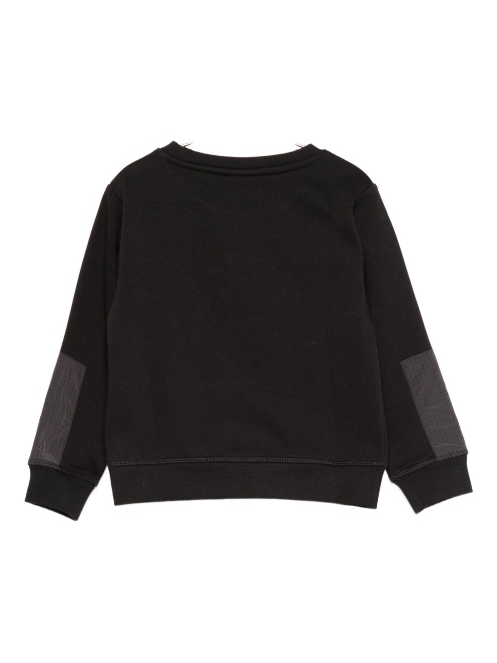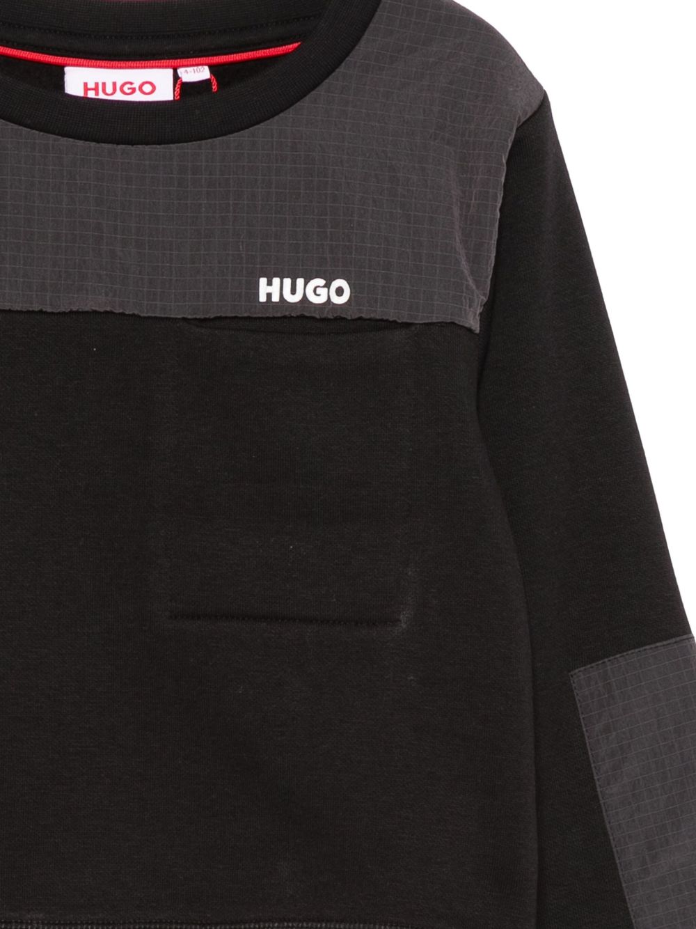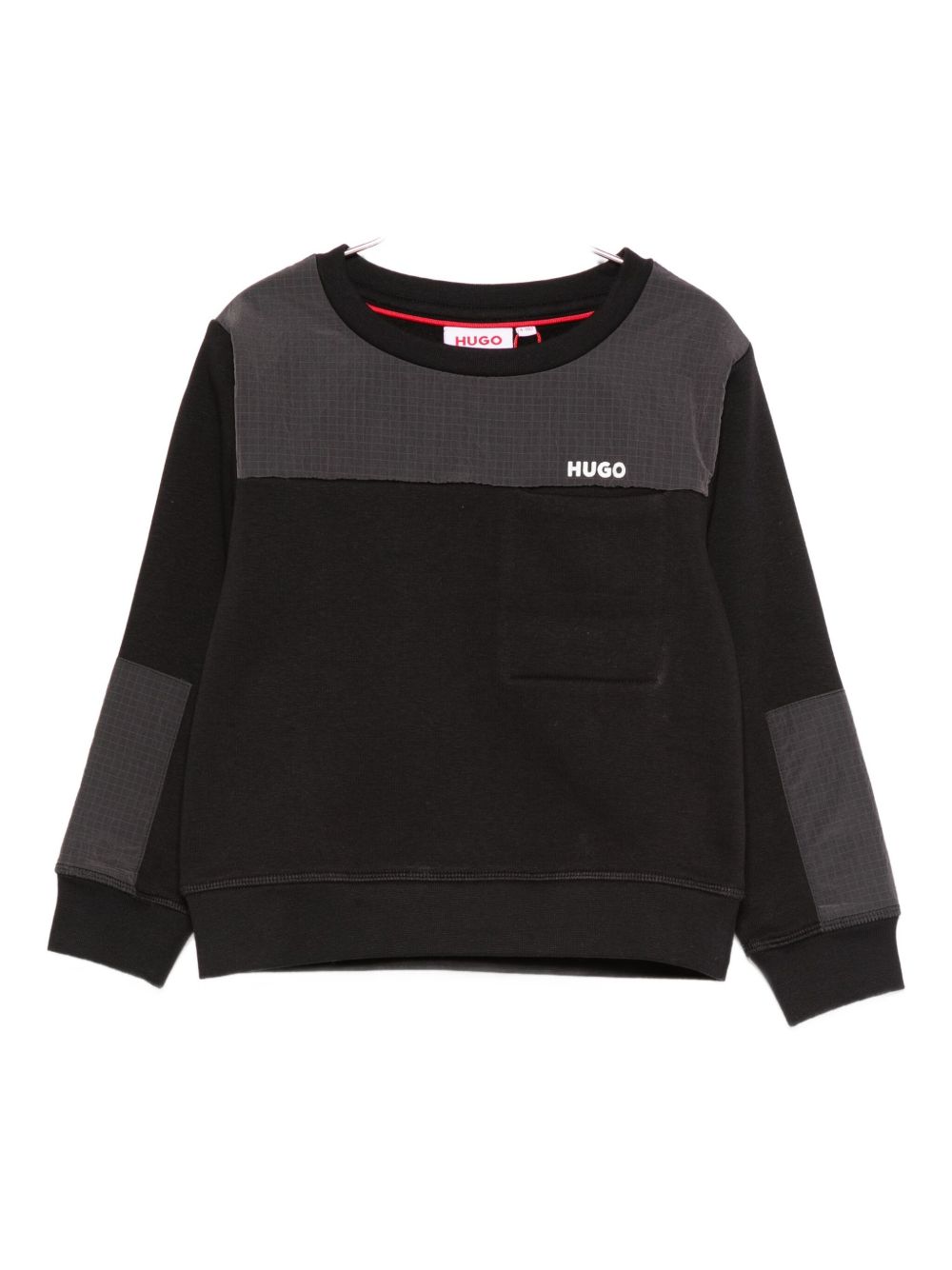 design a pannelli neri, tasca sul petto, maniche lunghe, scollo rotondo