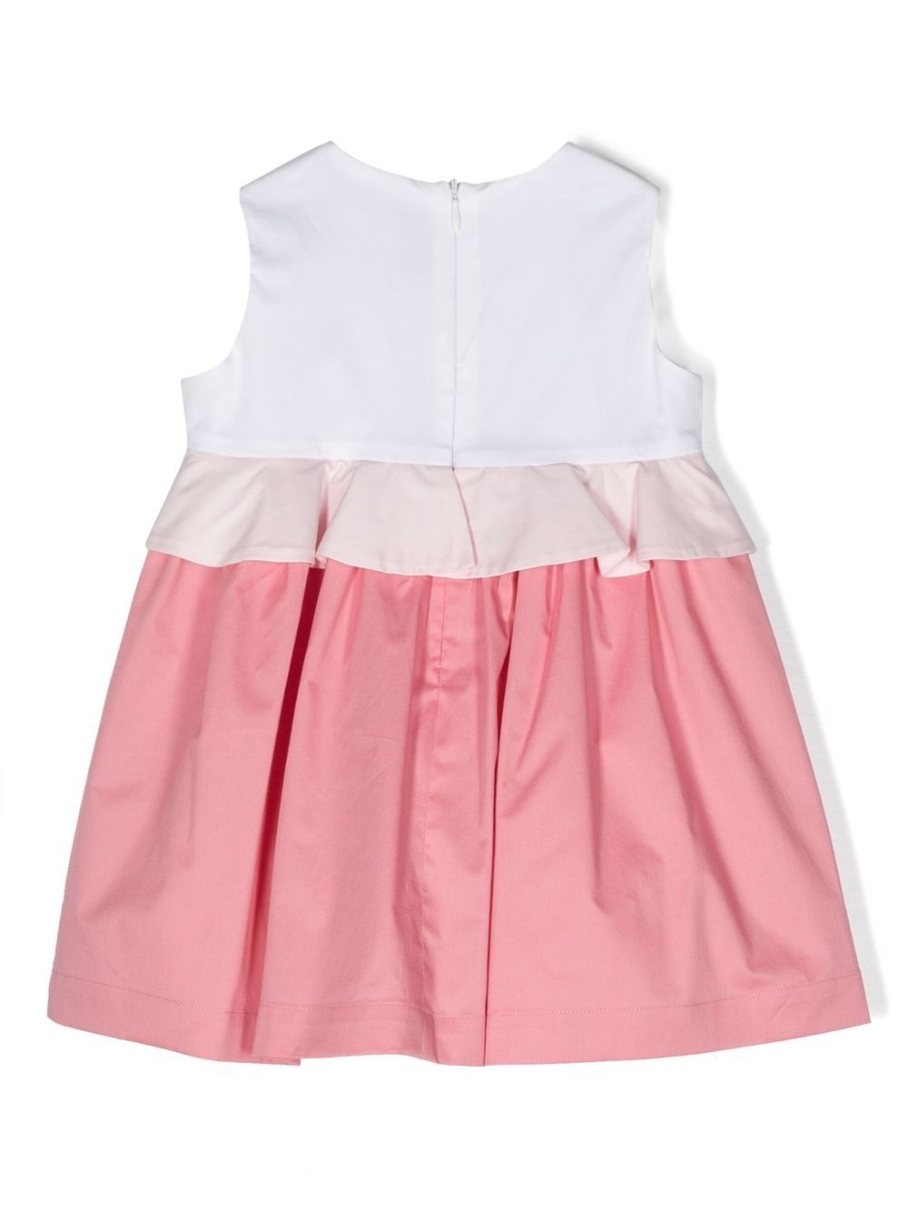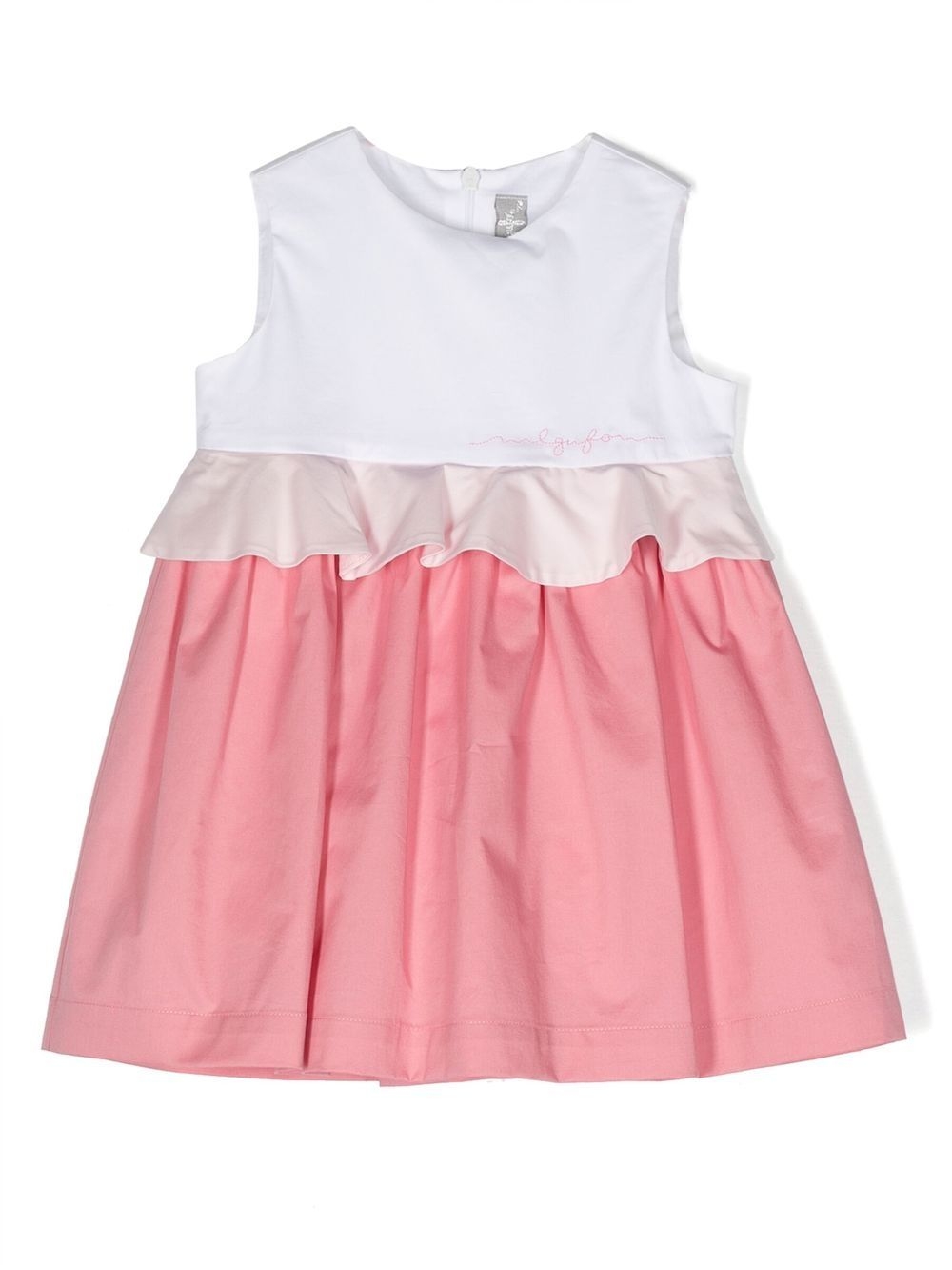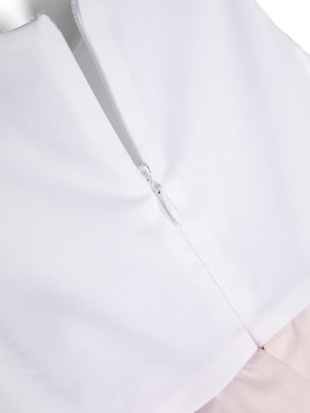 Abito con volants, Colore rosa, bianco, in cotone elasticizzato, bordo arricciato, girocollo, senza maniche, chiusura posteriore con zip e orlo dritto.
