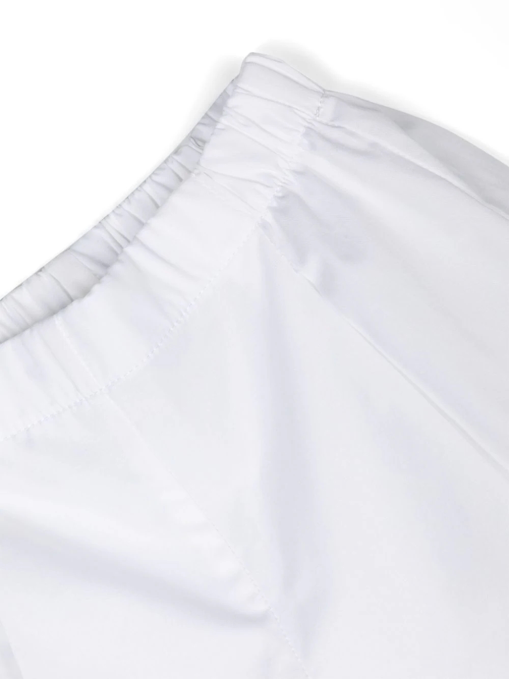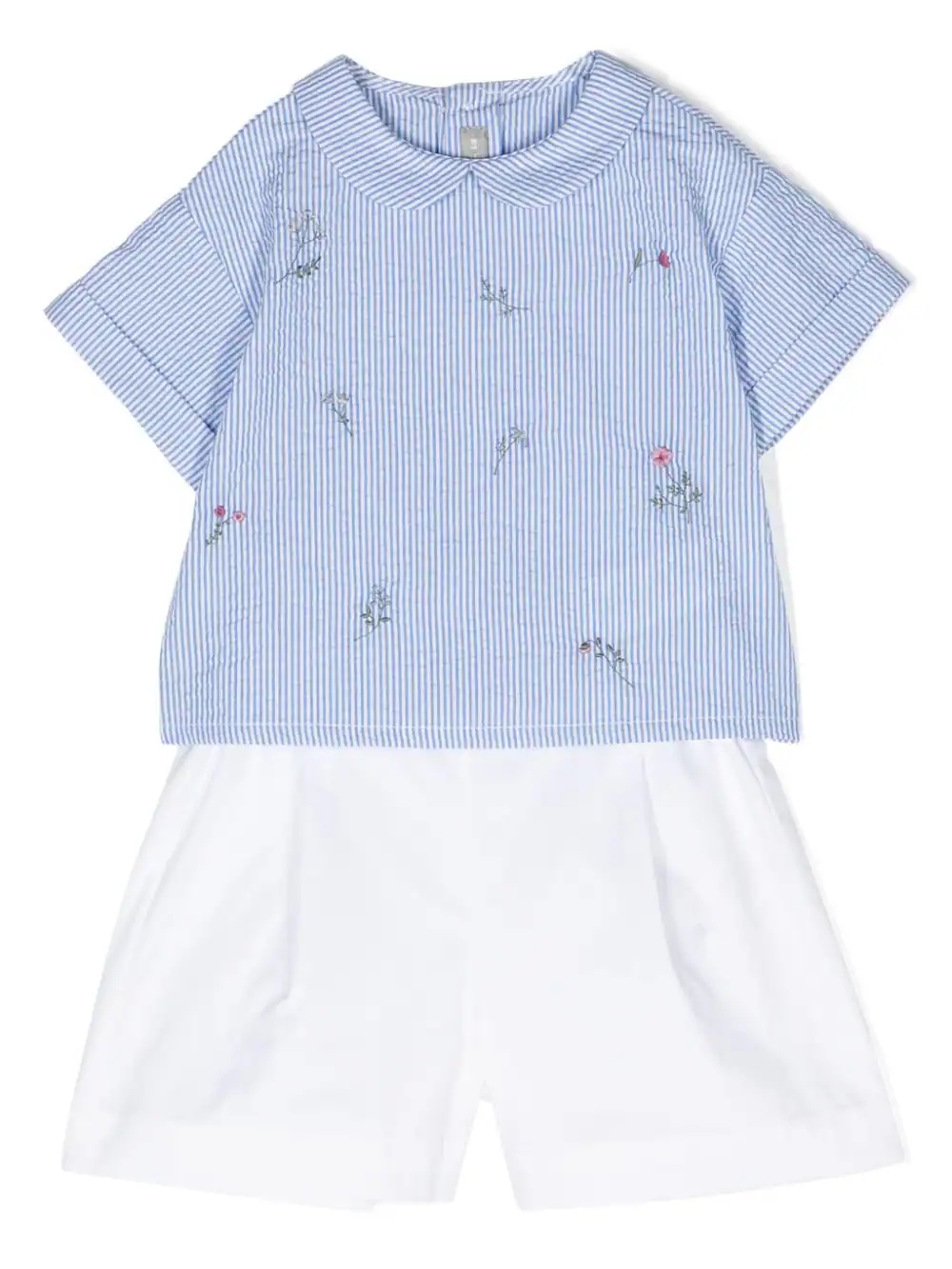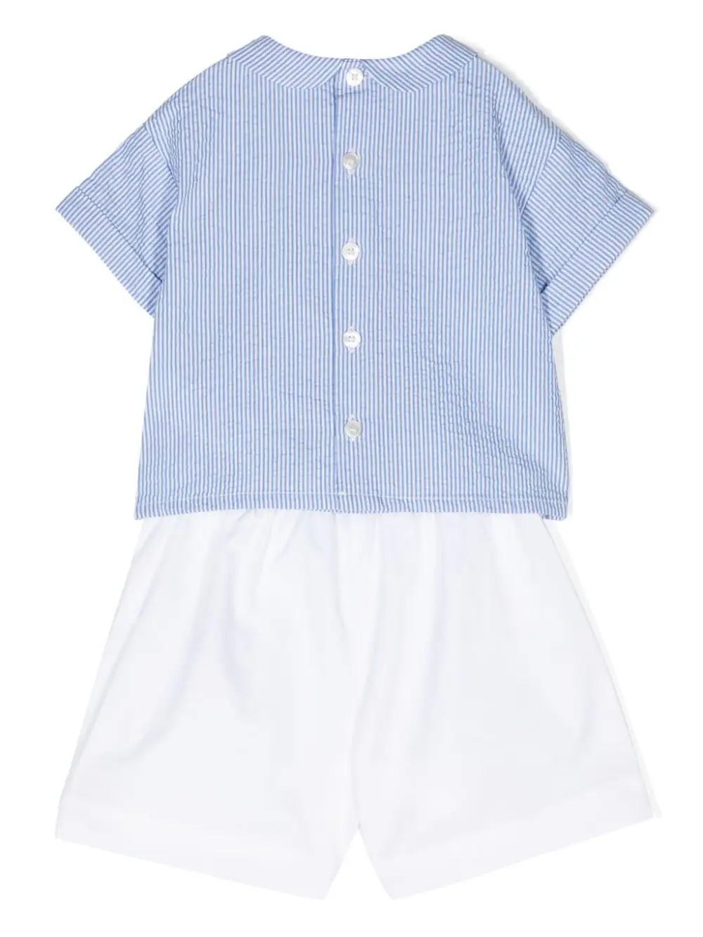 Completo a righe composto da shorts bianchi in cotone e camicetta azzurra rigata con stampa.