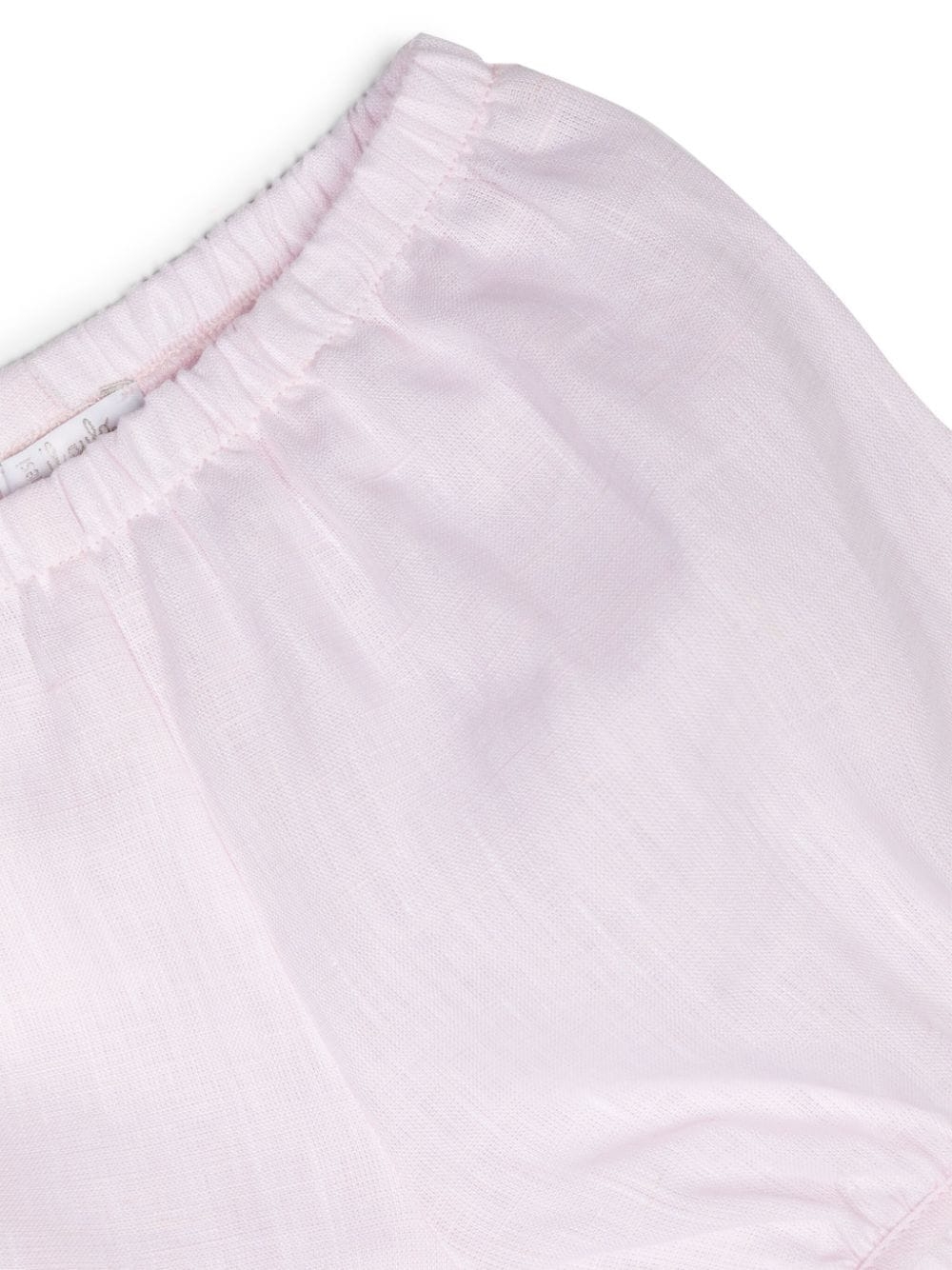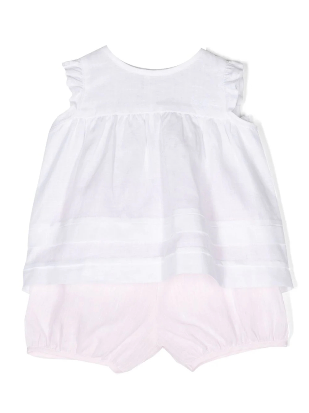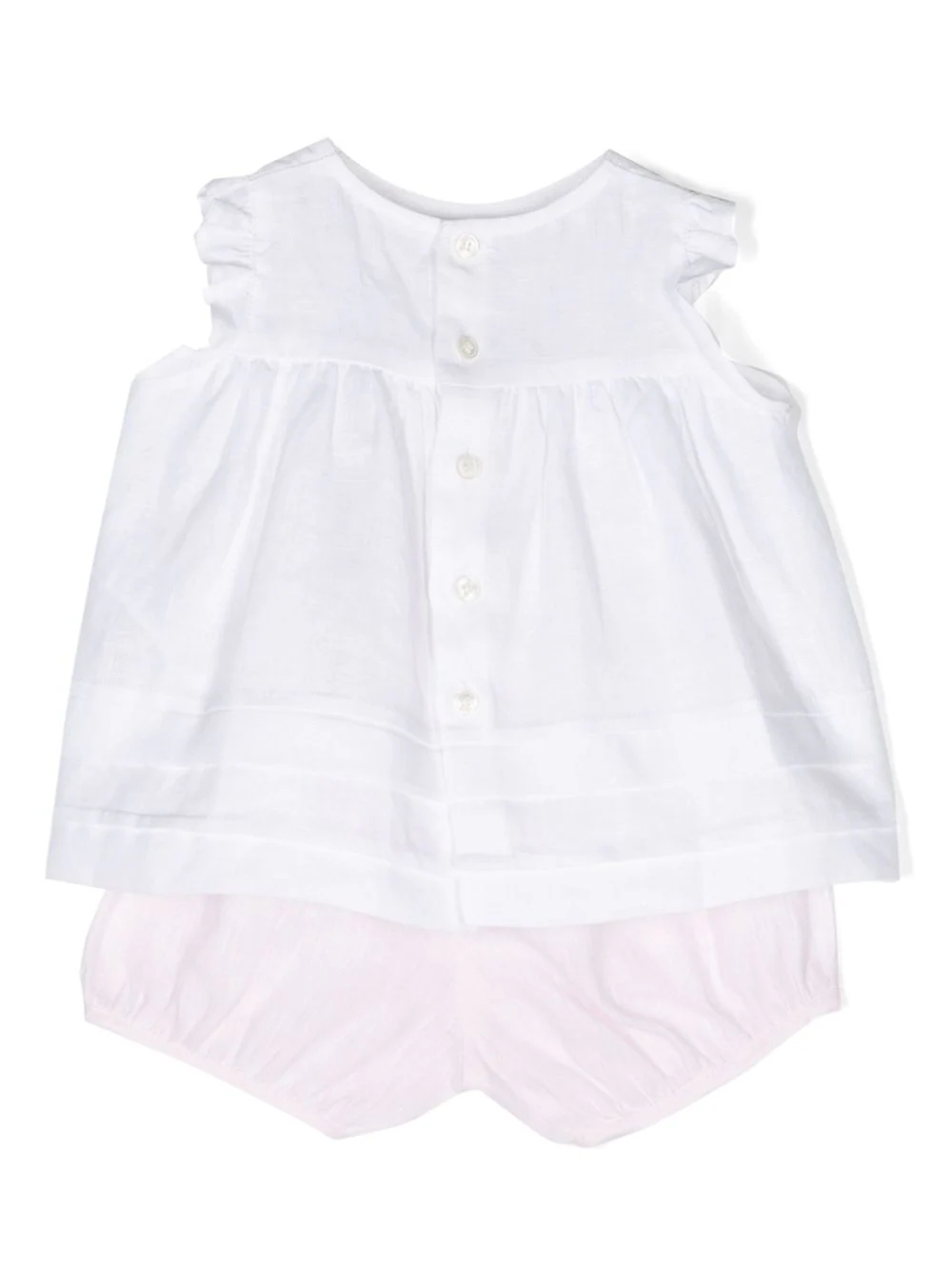 Completo in lino composto da shorts rosa e blusa bianca.