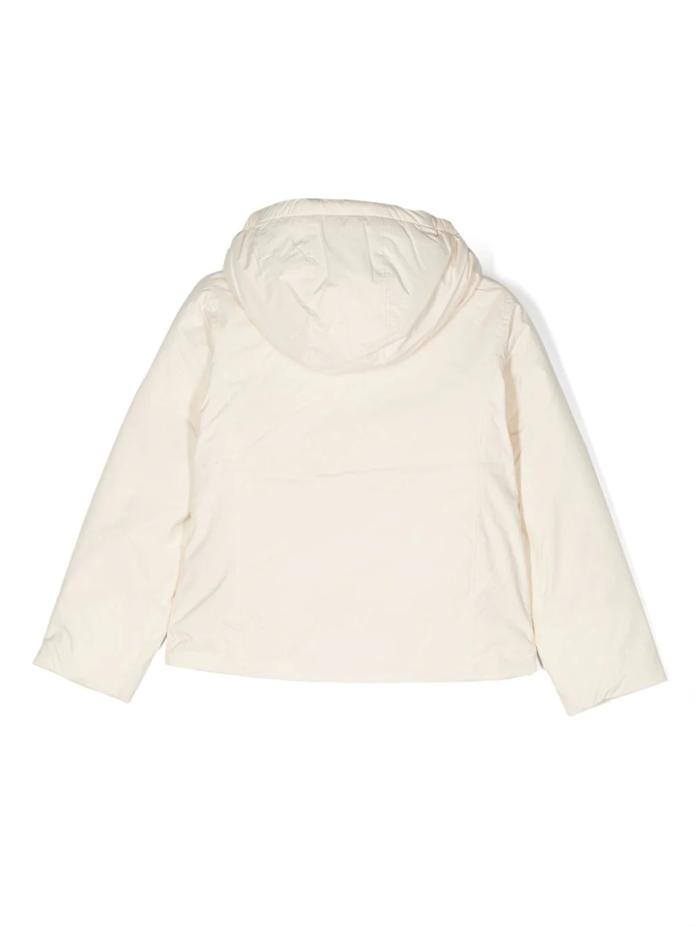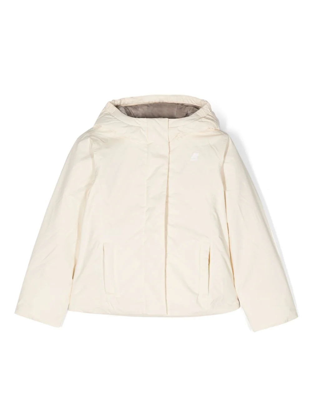 Beige mandorla, design imbottito, colletto classico, chiusura frontale nascosta e maniche lunghe.